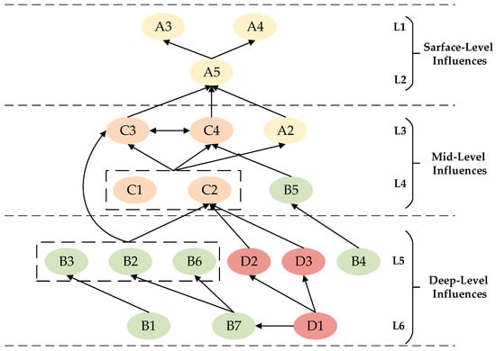 Figure 4 categorizes influencing factors into six levels, with L1 and L2 representing surface-level influences factors. Perceived technology usability (A3), perceived service accuracy (A4), and perceived system credibility (A5) are factors directly impacting human–machine collaborative diagnostic efficacy. L3 and L4 represent mid-level influences factors. Service precision level (C3), service coordination level (C4), perceived uncertainty (A2), data support level (C1), process adaptability level (C2), and system anthropomorphism capability (B5) are closely interrelated with both surface-level and deep-level factors. These factors are influenced by deep-level elements while simultaneously driving the evolution and development of surface-level factors. L5 and L6 represent deep-level influences factors: system operational capability (B2), system processing capability (B3), system interaction capability (B4), data privacy security (B6), industry standards (D2), platform rules (D3), System Knowledge Comprehensiveness (B1), Network Communication Security (B7), and Policy and Regulations (D1) constitute the most critical determinants of medical human–machine collaborative diagnostic efficacy. These factors are interrelated while exerting direct or indirect influence upon both surface-level and mid-level factors.
