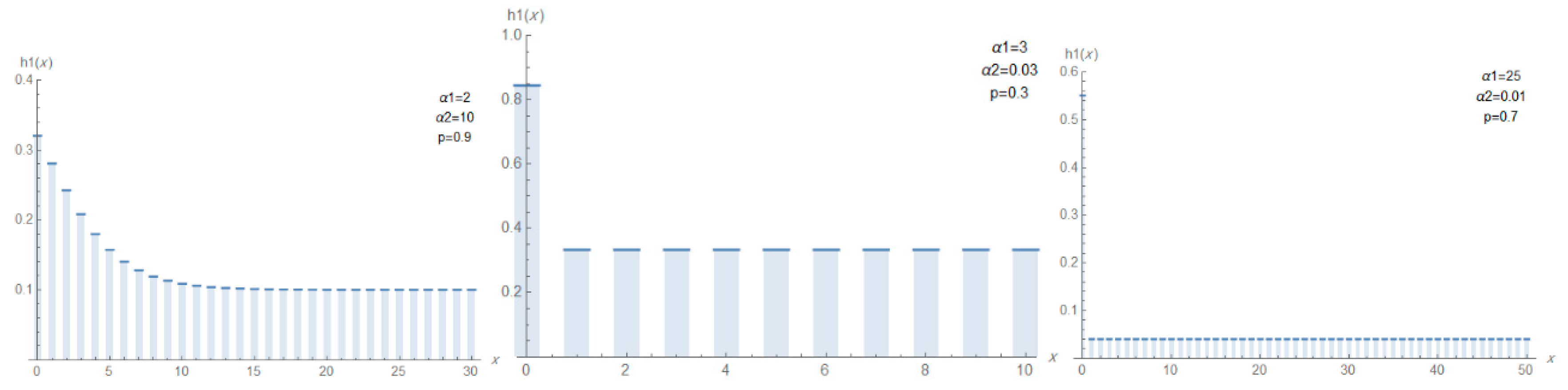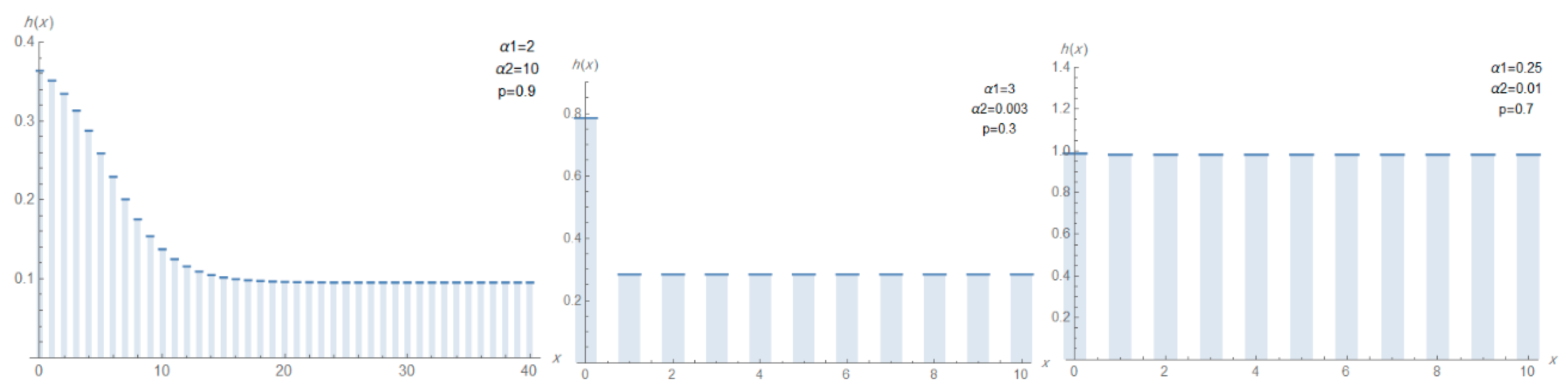 - Ahsan-ul-Haq, M.; Hussain, M.N.; Babar, A.; Al-Essa, L.A.; Eliwa, M.S. Analysis, estimation, and practical implementations of the discrete power quasi-Xgamma distribution. J. Math. 2024, 2024, 1913285. [Google Scholar] [CrossRef]