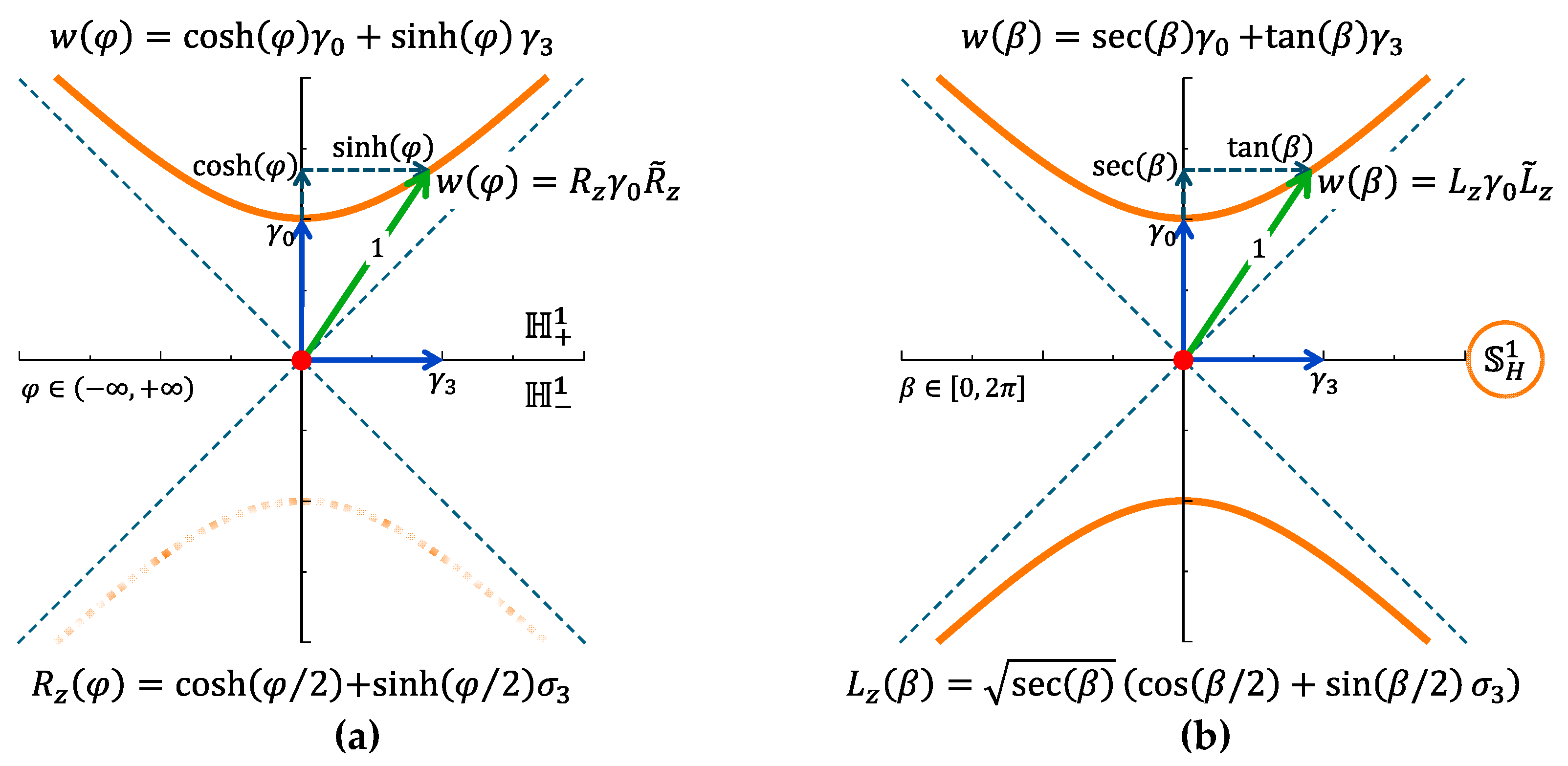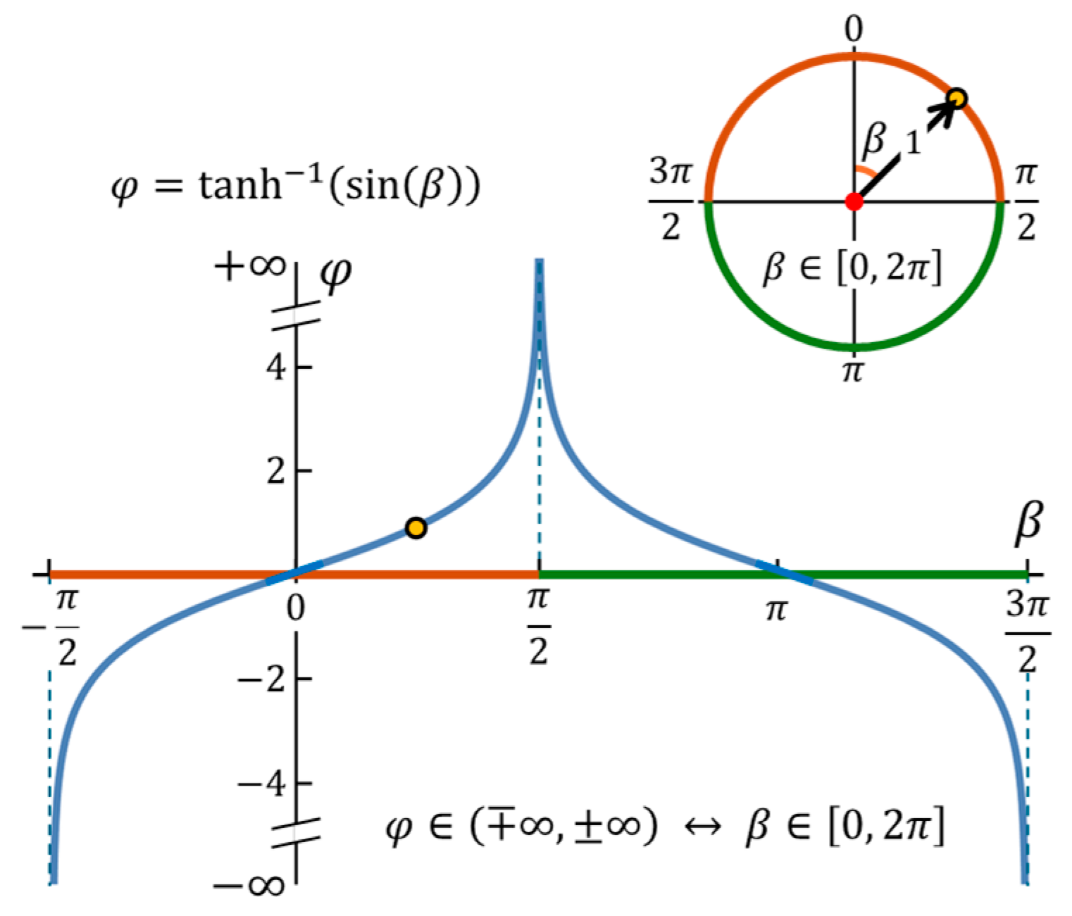Appendix B). This mapping transforms the unbounded rapidity parameter into a bounded angular domain, effectively compactifying the boost parameter space. In doing so, it closes the hyperbola into a hyperbolic one-sphere