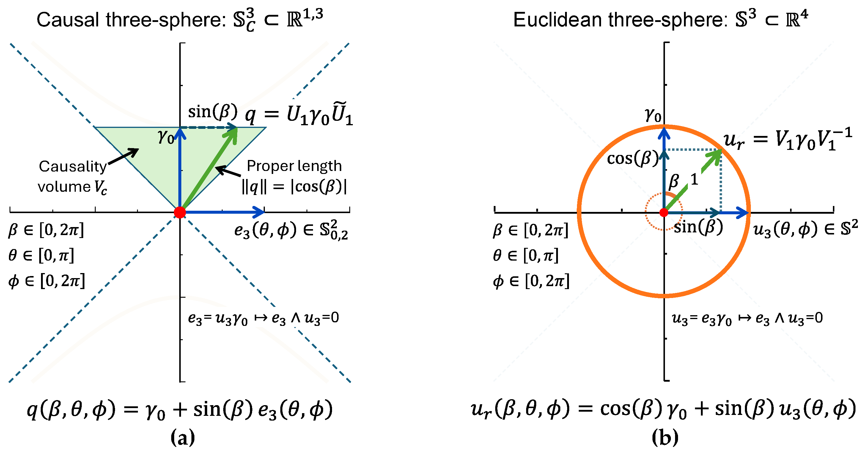 which encode hyperbolic, causal, and Euclidean structure within a shared geometric framework. The three-spheres possess a common temporal axis and a reciprocal temporal bivector plane, providing a continuous geometric bridge between Minkowski and Euclidean domains (Equation (10)). This real-domain duality constitutes an alternative to analytic continuation and offers a natural geometric basis for Wick-type transformations [
