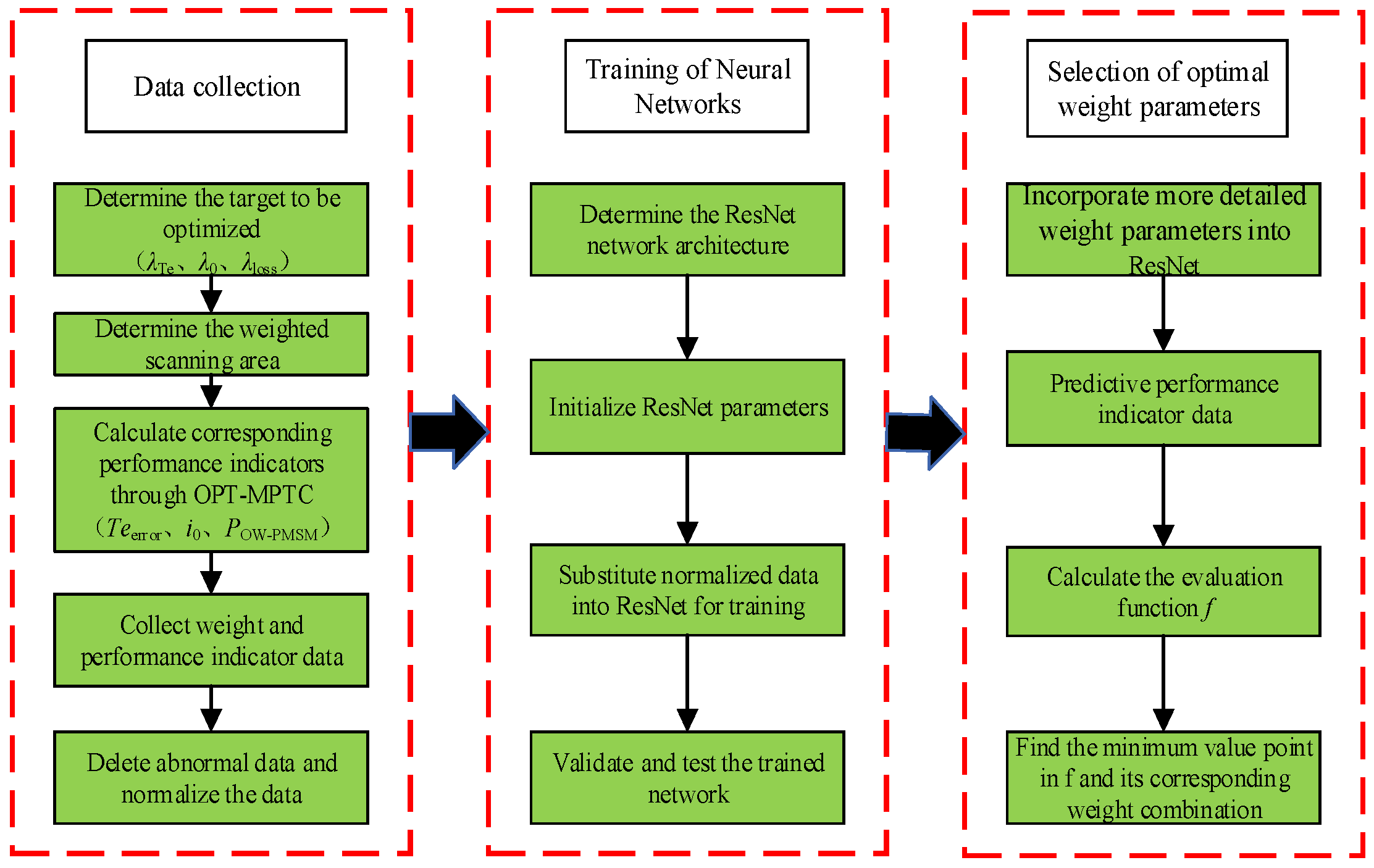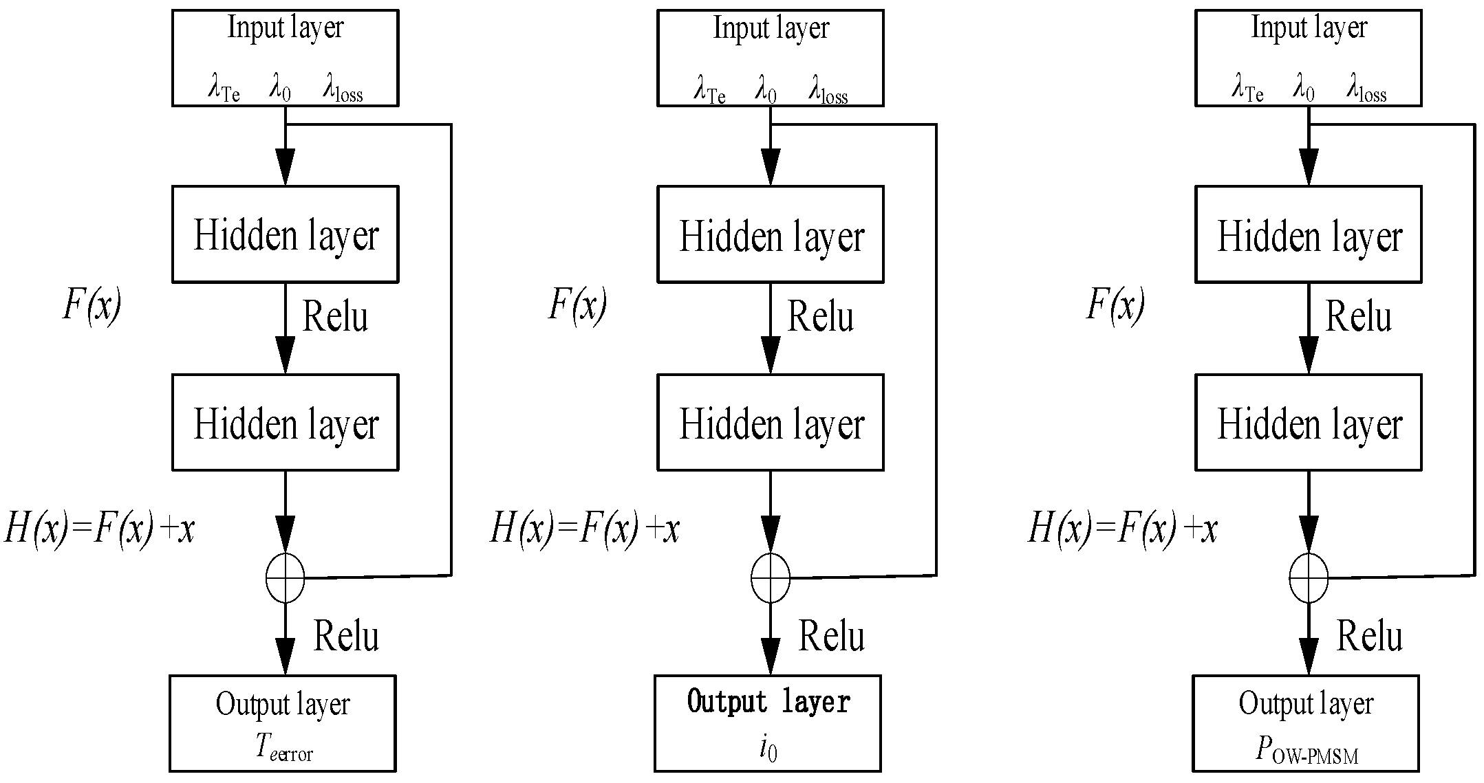 Section 3, the zero-sequence current and system loss of the OW-PMSM system are constrained by the OPT-MPTC cost function to further improve the performance of the drive system. However, there are three variables of different dimensions in Equation (22), and the selection of their corresponding weights λTe, λ0, λloss plays a key role in the output performance of the system. Therefore, this section uses the ResNet method to design the weight parameters of the OW-PMSM system model predictive torque control.