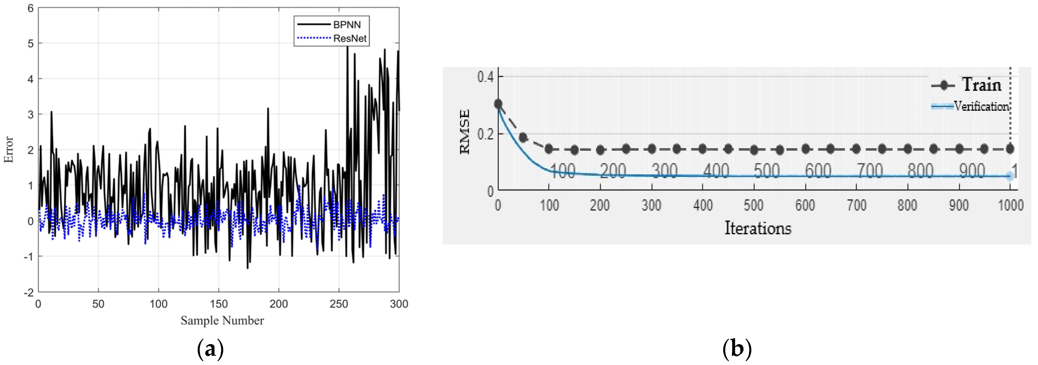 Figure 6a, the error of ResNet fluctuates within the range of [−0.5, 0.5], while the error of BPNN fluctuates within the range of [−0.5, 3]. In this case, the accuracy of ResNet is improved by 28% compared with that of BPNN, indicating the effectiveness of ResNet prediction. The training set had an initial RMSE of approximately 0.35, which dropped rapidly to 0.15 around the 100th iteration and remained stable in subsequent iterations. The validation set also had an initial RMSE of about 0.35, decreasing to 0.1 around the 200th iteration and staying stable afterward. The overall trend of the validation set was consistent with that of the training set, indicating no overfitting of the model and excellent generalization ability. Eventually, the training set stabilized at an RMSE of 0.15, while the validation set stabilized at 0.1. Both maintained low error levels with no significant increase in the later iterations, demonstrating high prediction accuracy of the model in both training and validation phases, as well as a stable and reliable training process. The model’s fast convergence and low, stable error indicate that the ResNet can effectively learn the mapping relationship between weight parameters and motor performance, which provides a guarantee for generating a high-precision weight database through subsequent offline training and further supports the multi-objective optimization performance of the OPT-MPTC during online table lookup.