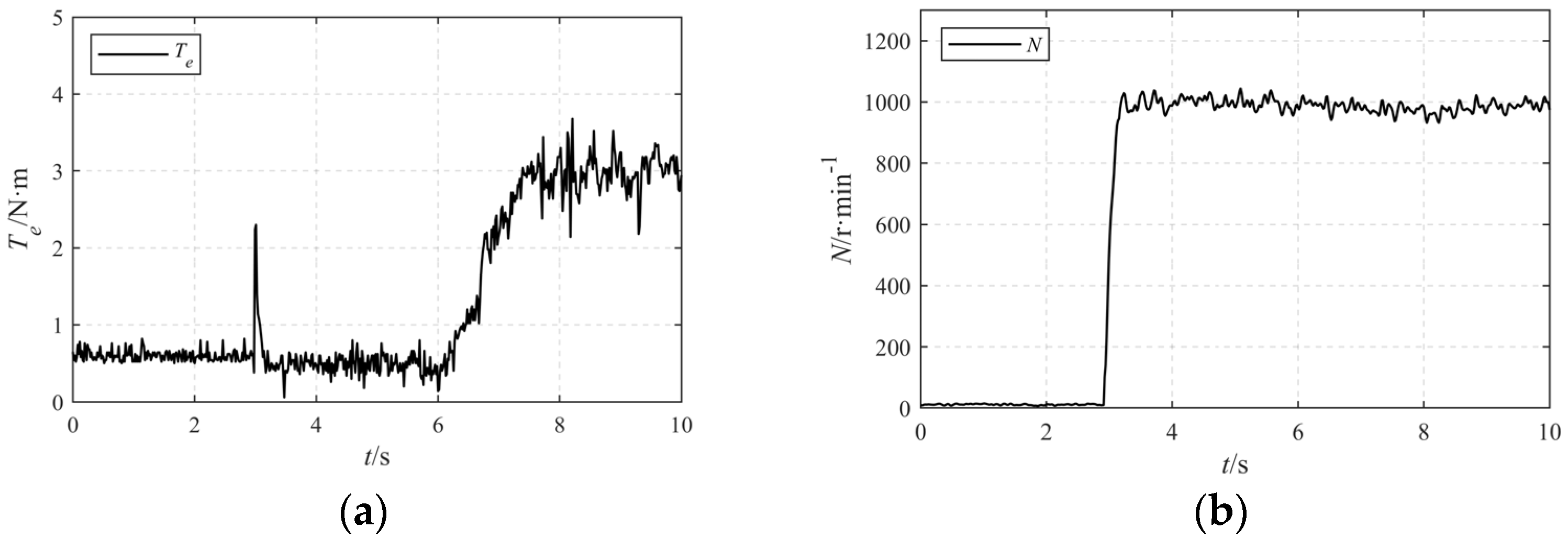 −1 at around 1.5 s. After the speed reached the target value, the load torque was loaded to 1 N·m. After verifying its stable operation, the load torque was loaded to 3 N·m. It can be seen that there is a slight downward trend in the speed curve, and then it stabilizes. After verifying the stable operation of the load condition, the load torque was unloaded to 1 N·m, and the corresponding speed in the speed curve increased. This experiment can verify the stability of the control strategy proposed in this paper under the OW-PMSM dynamic loading and unloading condition.