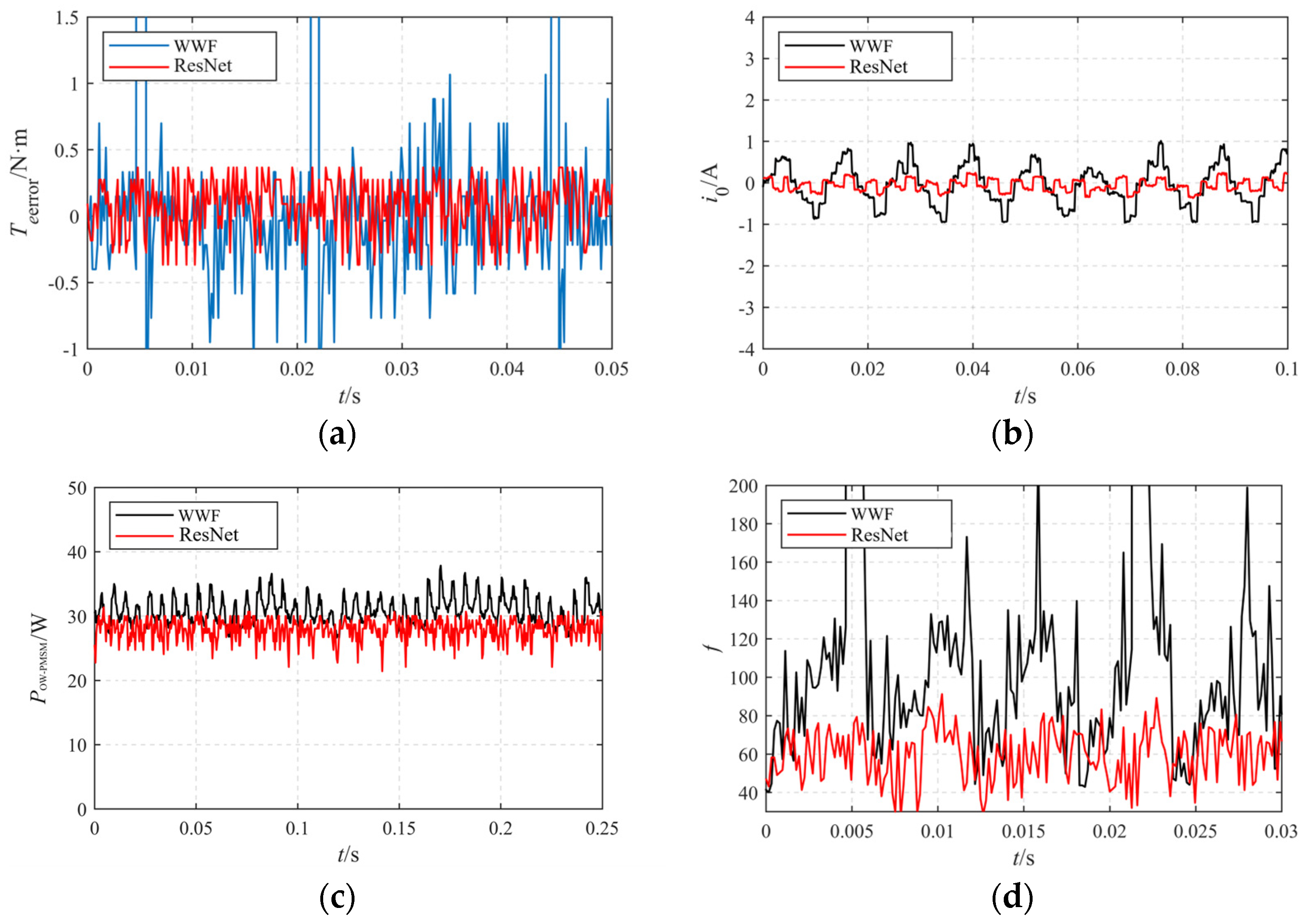 To sum up, the OW-PMSM system increases the capacity of the traditional permanent-magnet synchronous motor drive system and has a more flexible control method, but due to its special structure, the system loss becomes larger, so the MPTC with multi-objective constraint ability can be used to drive the OW-PMSM to optimize the system loss. In order to avoid the system jitter caused by the search method in loss optimization, this paper uses the method of establishing the mathematical model of iron loss resistance and uses the same variable to express the switching loss and the OW-PMSM loss, so as to carry out the constraint optimization. Among the methods for designing the weight parameters of variables corresponding to different dimensions, the online weight calculation method has high accuracy, but it consumes a lot of MPTC online computing resources. Using the WWF method, when MPTC constrains many targets, it can easily lead to a linear increase in algorithm complexity and reduce the efficiency of the control strategy. Therefore, this article adopts the method of ResNet to design the weights of variables corresponding to multiple different scales. Offline training of the ResNet can design MPTC weight parameters without occupying MPTC computing resources. The system loss optimization and weight parameter design can ensure the operation performance of the OW-PMSM drive system and further improve the efficiency of the OW-PMSM drive system and control algorithm under the premises of low cost and small volume.