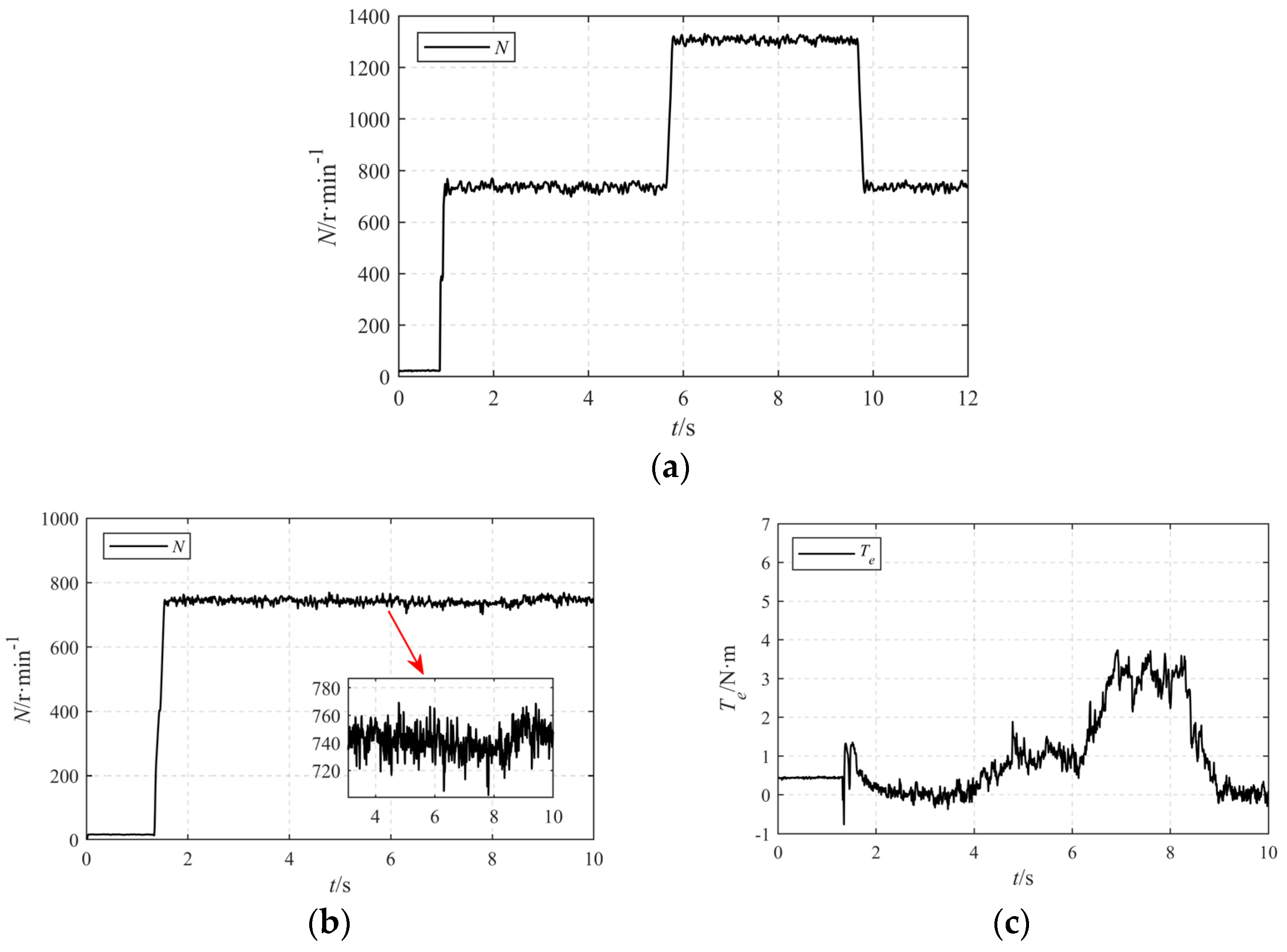 −1; after stabilization, the load torque is increased to 1 N·m; upon re-stabilization, it is further increased to 3 N·m; finally, after achieving stability again, the load is gradually reduced to 0 N·m. The speed–torque diagrams for verifying the dynamic response are presented in