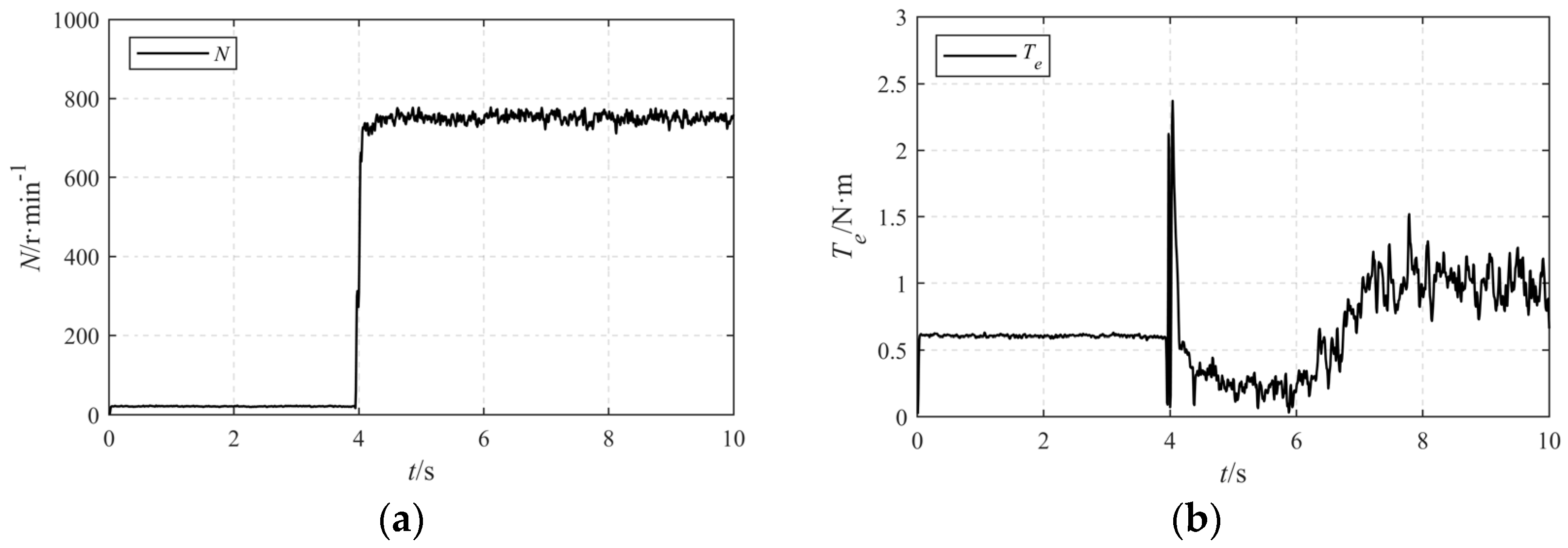 Figure 16, under this condition 2, the OW-PMSM has been verified to achieve fast startup, with excellent steady-state performance. It can be observed that under this operating condition, the OW-PMSM enables a dynamic acceleration of 750 r·min