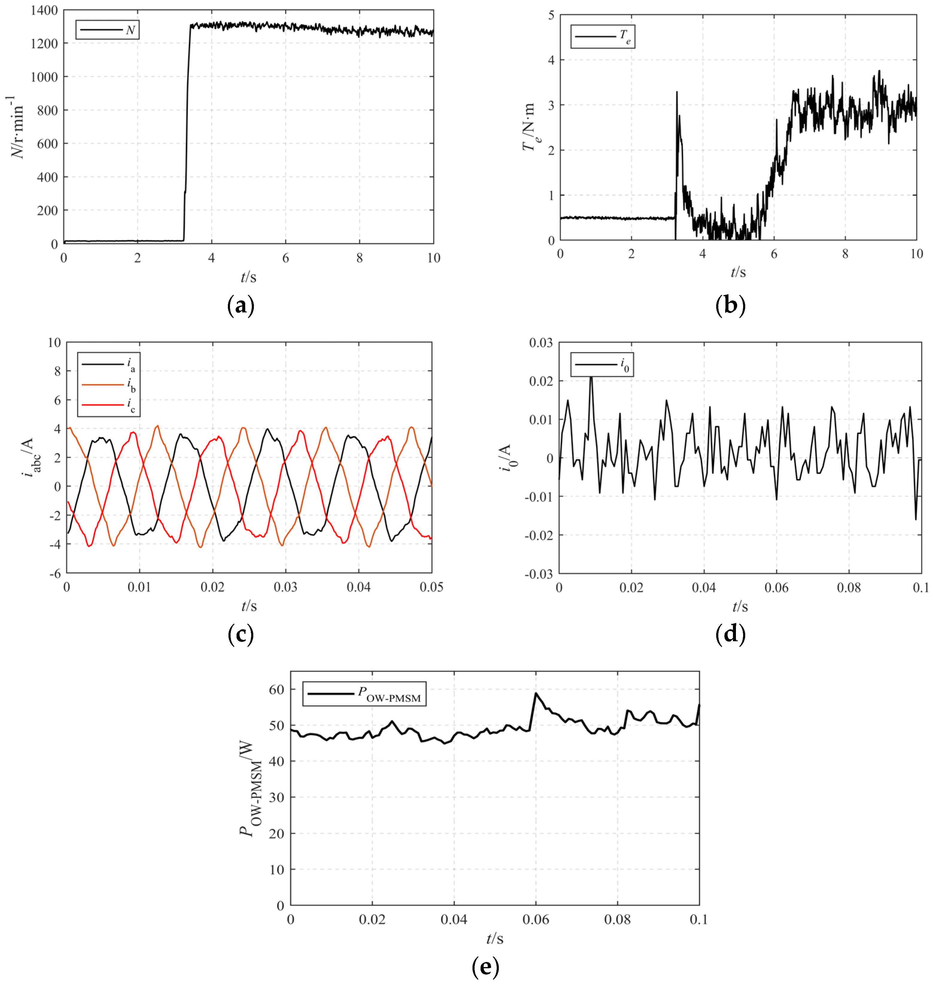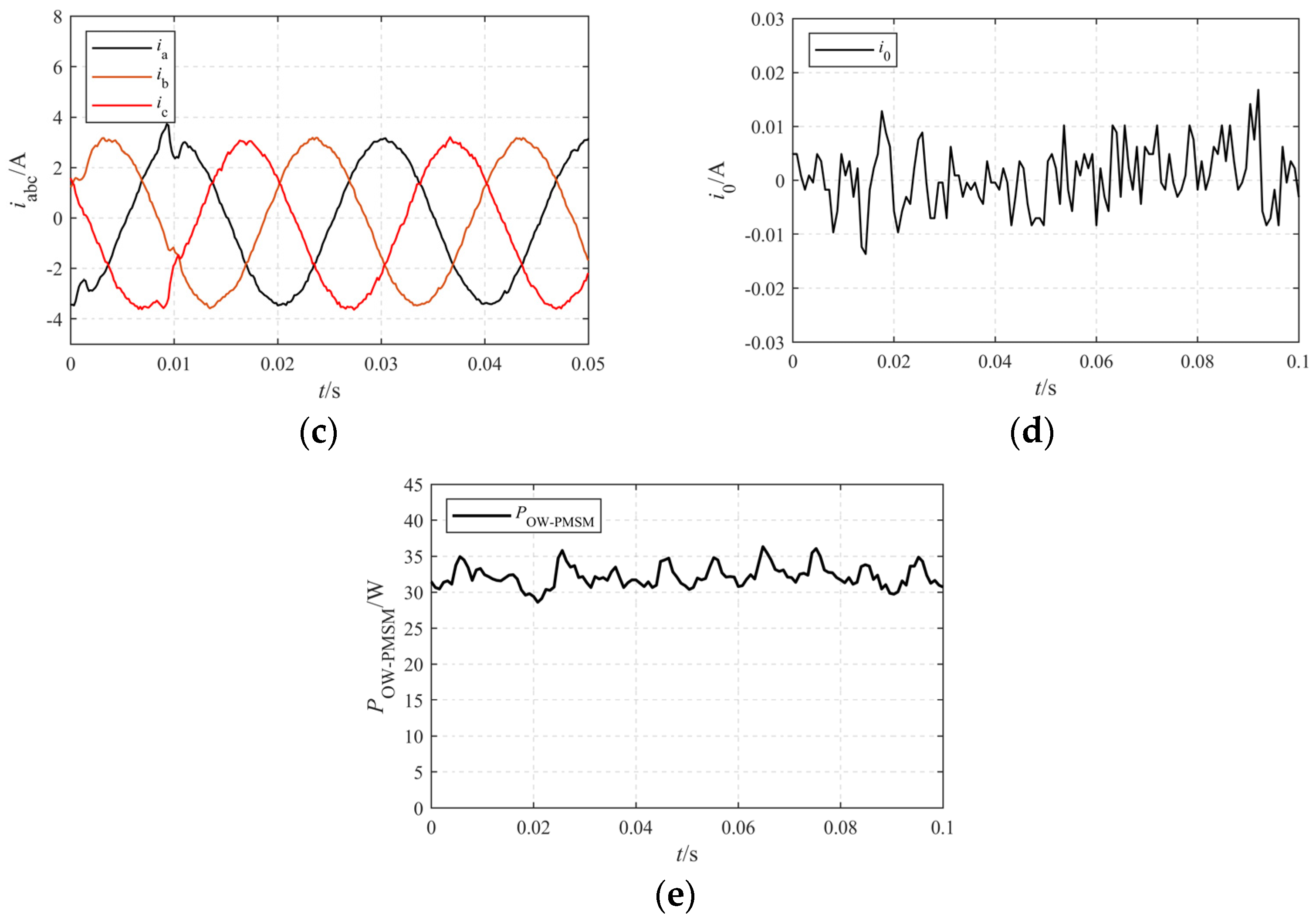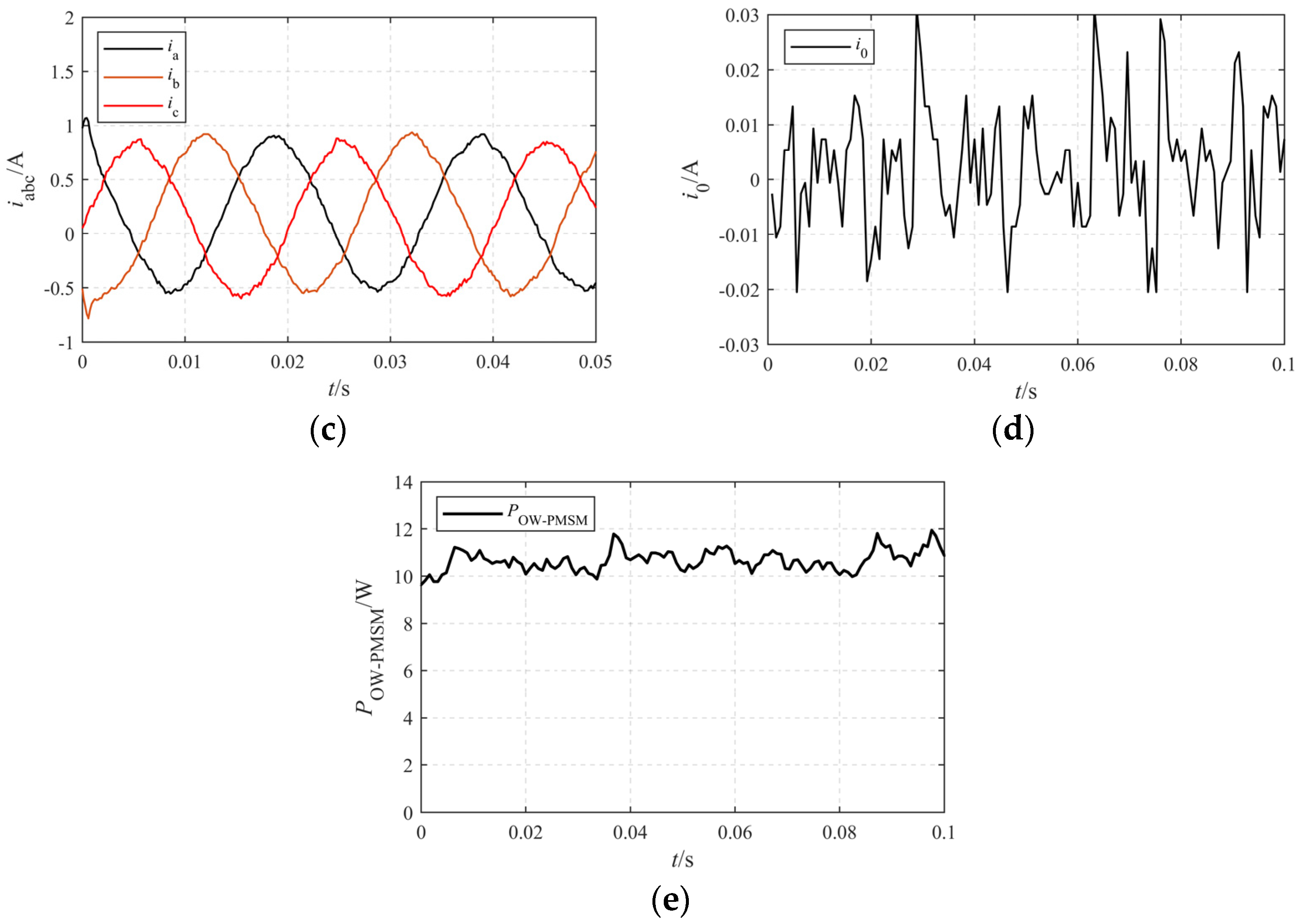 −1. With a load application of 3 N·m, the amplitude of the three-phase currents is approximately 3 A, the fluctuation range of the zero-sequence current within 0.02 A, and the power loss of the OW-PMSM drive system is roughly 35 W. Verified the stability of the system under this operating condition.
