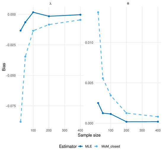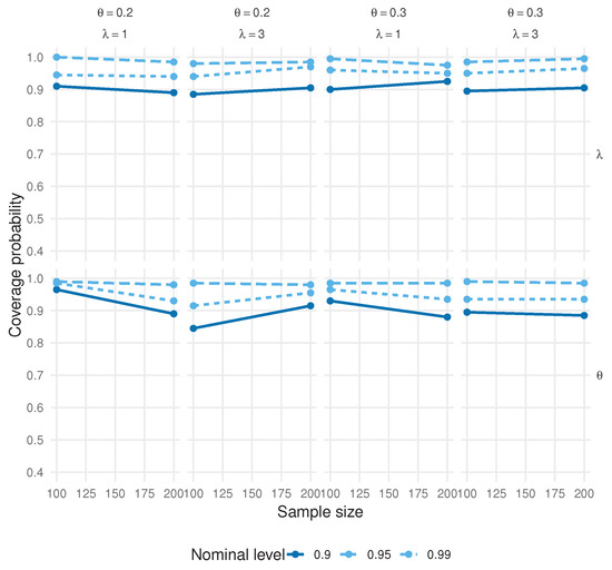 A further point of reassurance concerns the use of Wald confidence intervals in a discrete setting. Although discrete models sometimes induce irregular likelihood shapes and poor Wald performance, the model benefits from a smooth and strictly concave log-likelihood in both parameters. The independence between the symmetric sign and the Poisson magnitude yields well-behaved score functions and a Fisher information matrix that remains finite and positive for all admissible . These properties ensure that the MLEs lie well within the interior of the parameter space and satisfy standard differentiability conditions, so Wald intervals inherit the usual asymptotic validity even in finite samples. This explains why the simulation results show accurate coverage levels despite the inherent discreteness of the data-generating process. The observed coverage behavior can be directly linked to the analytical form of the Fisher information derived in Section 5.8. When the zero mass is large, the term in the information matrix (where ) dominates, yielding high curvature of the log-likelihood with respect to and, therefore, tighter confidence intervals. Conversely, the information component associated with depends on both and through , which can be relatively flat for small . This explains why the empirical coverage for tends to be slightly conservative in small samples, whereas the coverage for rapidly approaches nominal levels. As the sample size increases, both components of the Fisher information scale linearly with n, leading to asymptotic normality and the near-exact coverage observed for .