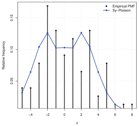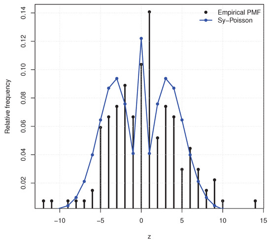 As a preliminary diagnostic, the runs test reported in ref. [18] indicates that while the raw series is not random (p-value ), the differenced series behaves as an approximately random sample (p-value ), supporting independent-sample modeling at the differenced scale. We fit the symmetric Poisson model by maximum likelihood and compare it with standard competitors: discrete Laplace , perturbed discrete Laplace [6], discrete normal [5], and the extended Poisson introduced in ref. [18]. Model fit is assessed via log-likelihood and information criteria (AIC/BIC), using grouped frequencies consistent with ref. [18] for the goodness-of-fit evaluation.