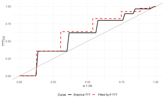 We fit by maximum likelihood, obtaining . A Kolmogorov–Smirnov (K–S) test gives , indicating an adequate fit. Furthermore, we also find the percentile estimators by fixing of the parameters, which are given by . Figure 9 overlays the fitted probability mass function on the empirical frequencies. Figure 10 contains the total time on test (TTT) plot, as described in Section 4.2. The empirical TTT curve was compared to the TTT curve implied by the fitted model. A close alignment of the curves indicates an adequate fit.