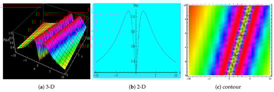 Depicts the 3-D, 2-D and contour representations of Equation (38) for , , , , , , , , , , x = −6 to 6 and t = 0 to 10.