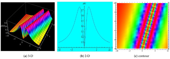 Depicts the 3-D, 2-D and contour representation of Equation (28) for , , , , , , , , , , , , x = −10 to 10 and t = 0 to 10.