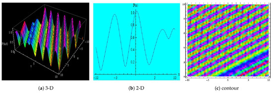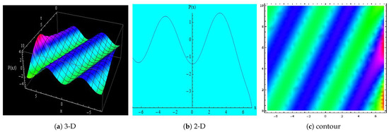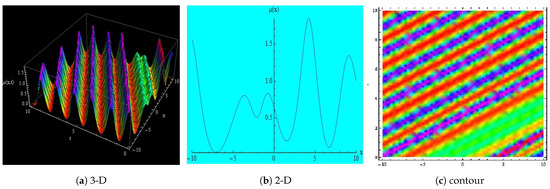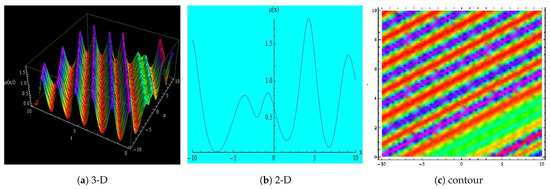 Depicts the 3-D, 2-D and contour representations of Equation (33) for ; ; ; ; ; ; ; ; ; ; ; ; , x = −10 to 10 and t = 0 to 10.