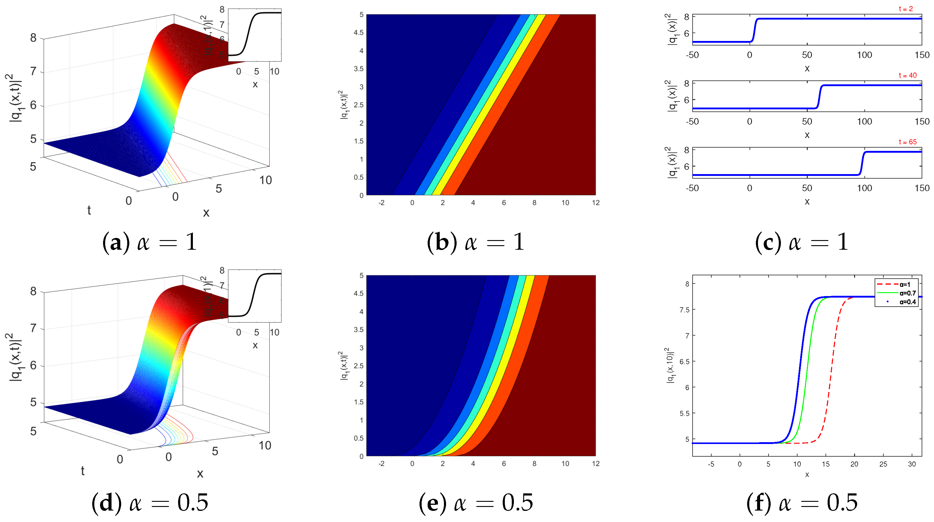 Figure 1c, respectively. However, the effect of the conformable parameter on the three-dimensional plot, the contour plot, and the two-dimensional plot of the kink-type soliton solutions of