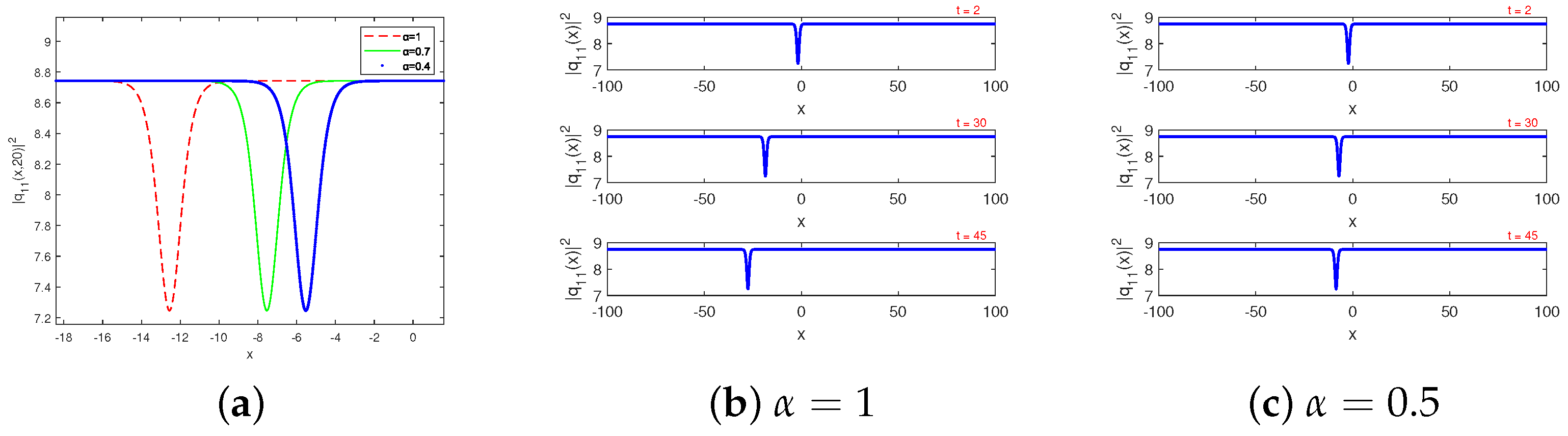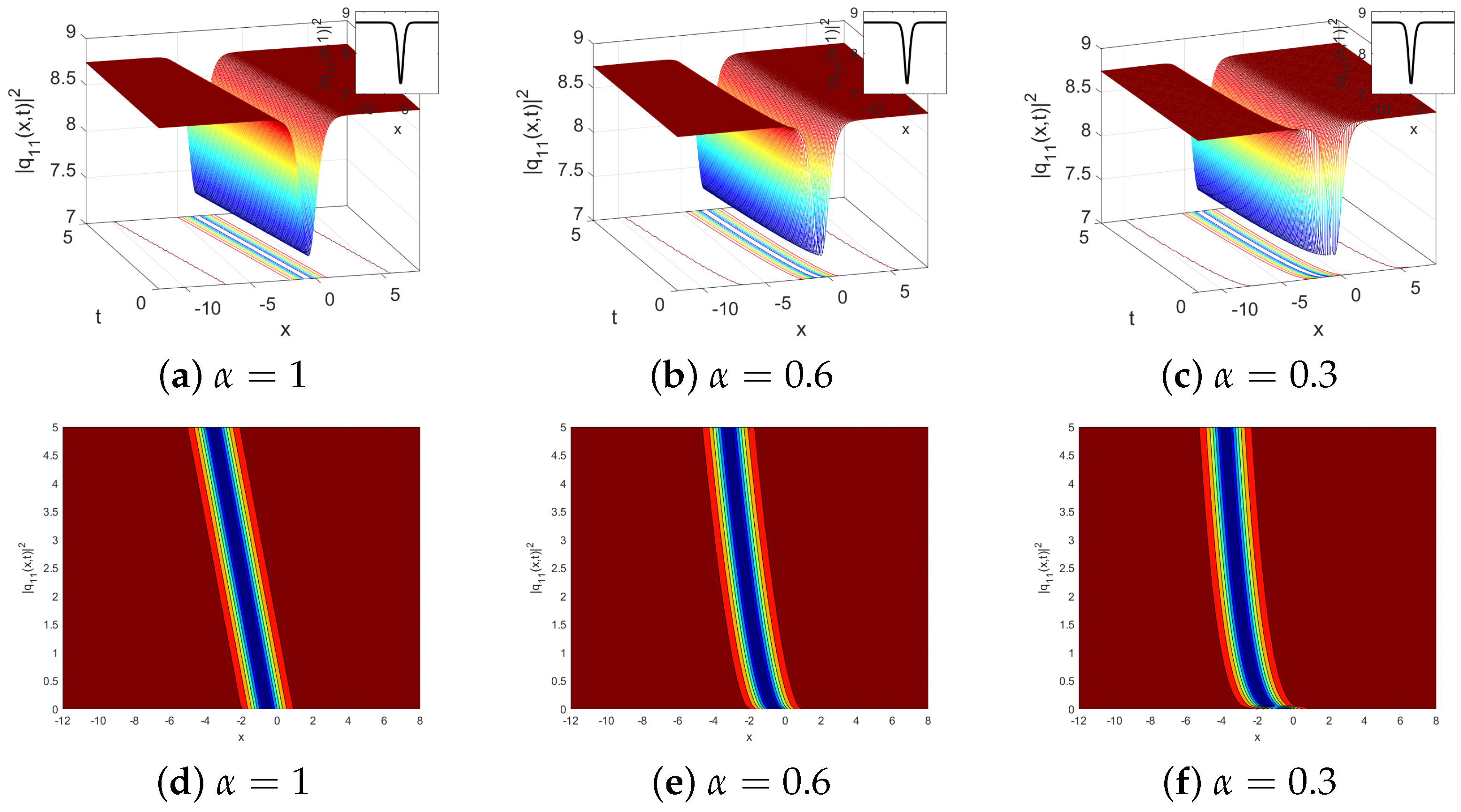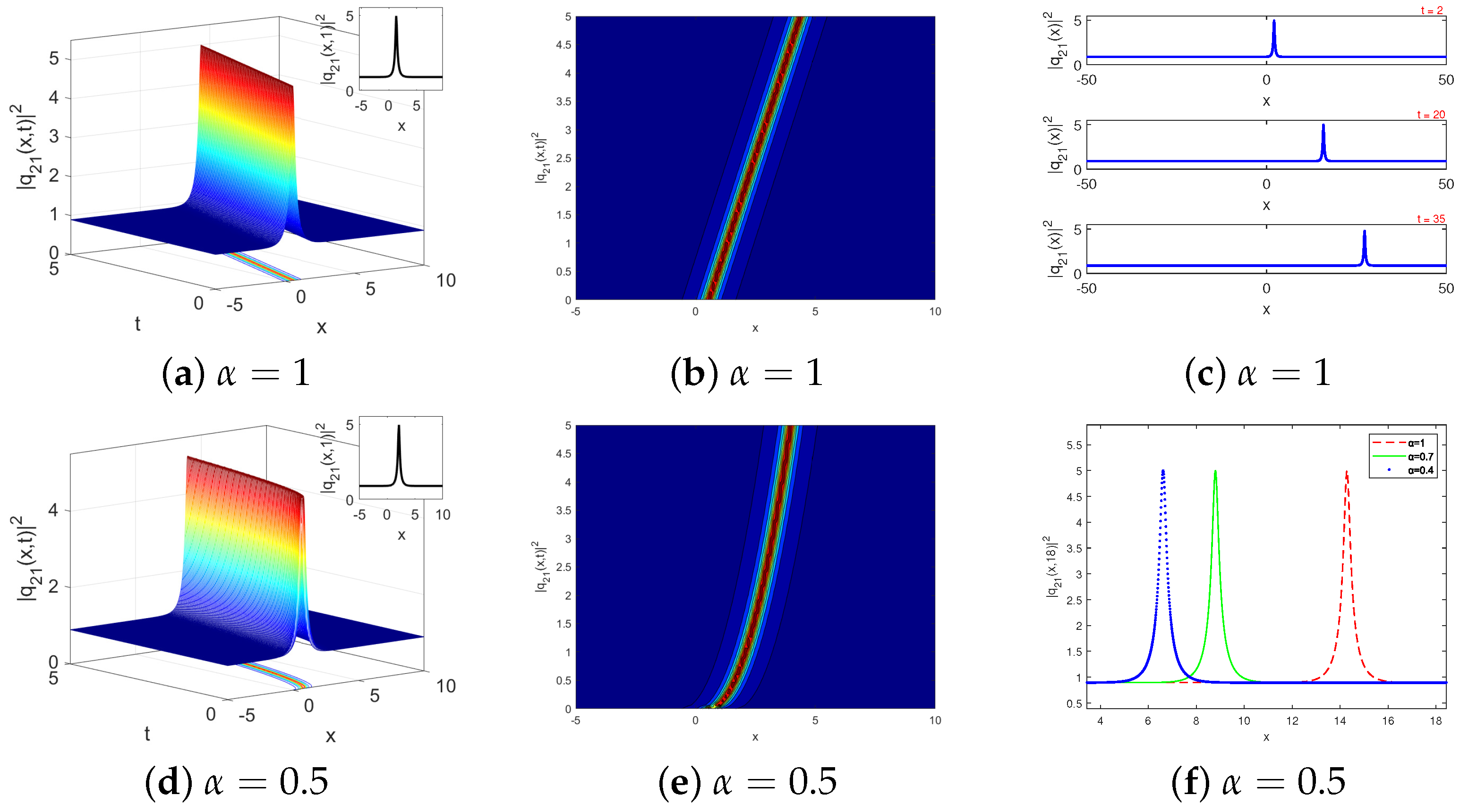 Figure 5a illustrates the impact of the conformable parameter on the soliton solution