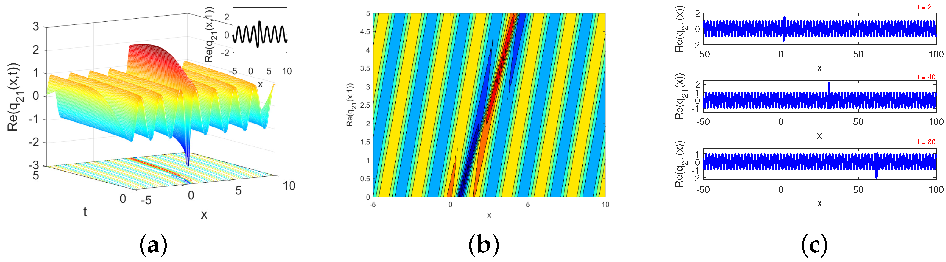 Figure 2c depict the three-dimensional plot, the contour plot, and the effect of the temporal parameter on the two-dimensional plot of the wave optical solution