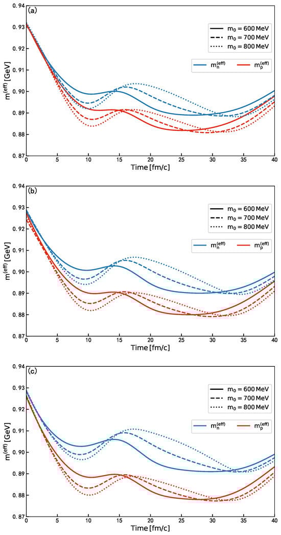 In Figure 2, we present the time evolution of the effective masses of protons and neutrons for and 800 MeV in the 108Sn + 112Sn, 112Sn + 124Sn, and 132Sn + 124Sn systems. Here, the effective mass is defined as the nucleon’s energy at zero momentum: