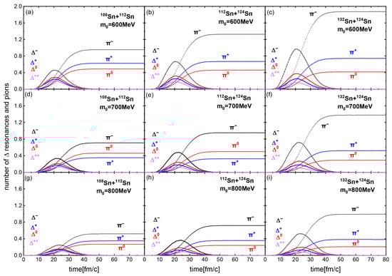 In Figure 3, we show the time evolution of the number of produced resonances and pions for and 800 MeV in the 108Sn + 112Sn, 112Sn + 124Sn, and 132Sn + 124Sn systems. In each system, we observe that the number of produced particles decreases as increases. From Figure 1 and Figure 3, intuitively, one expects more baryons are produced with a higher central density, but this is not the case in our study. As the ratio of the system increases, more mesons are produced. This is because a higher neutron-to-proton ratio enhances the probability of production of baryons through inelastic scatterings such as , which predominantly decay into .