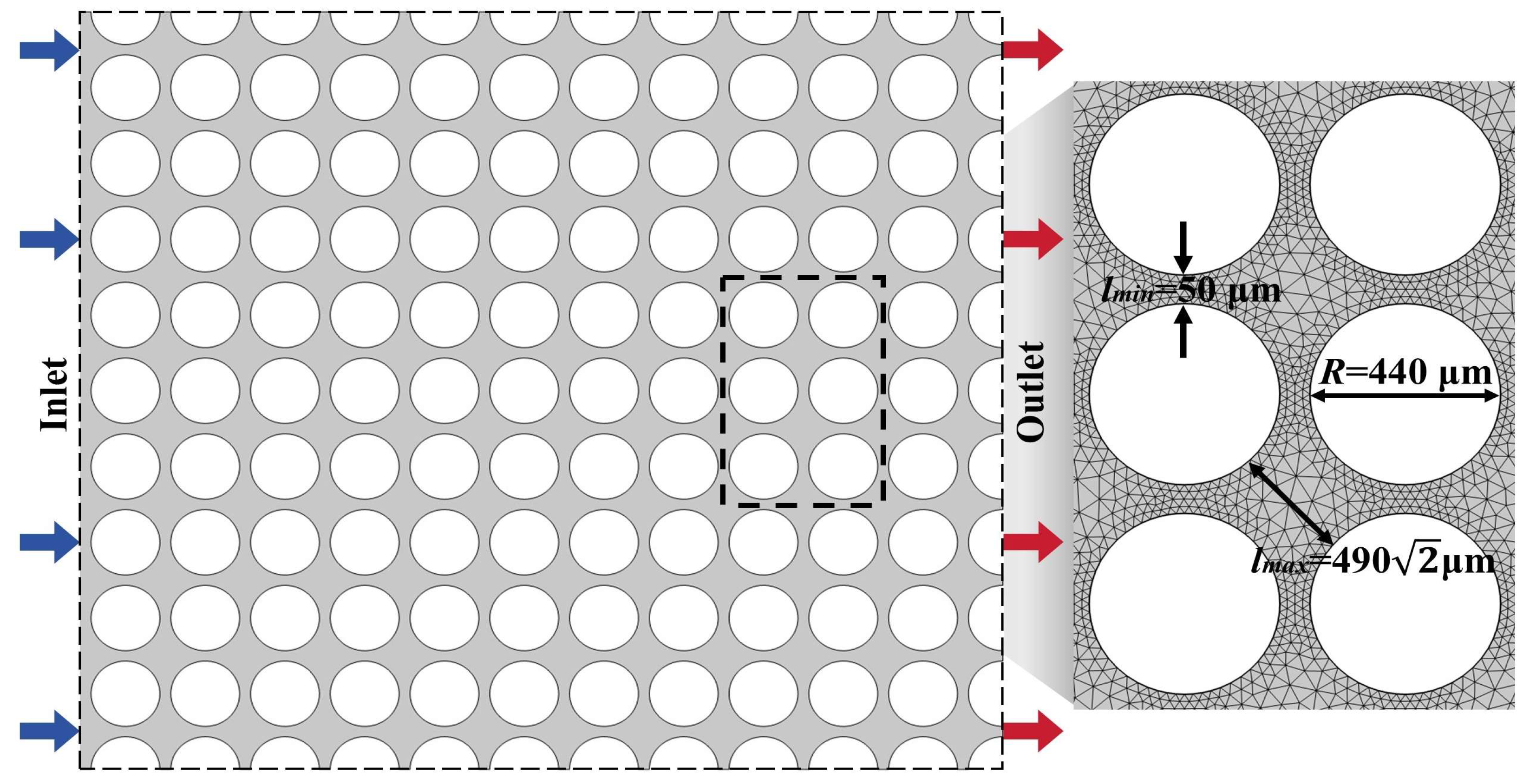- The porous medium consists of uniformly arranged circular particles with different surface wettability, ignoring the heterogeneity of particle size and geometry;