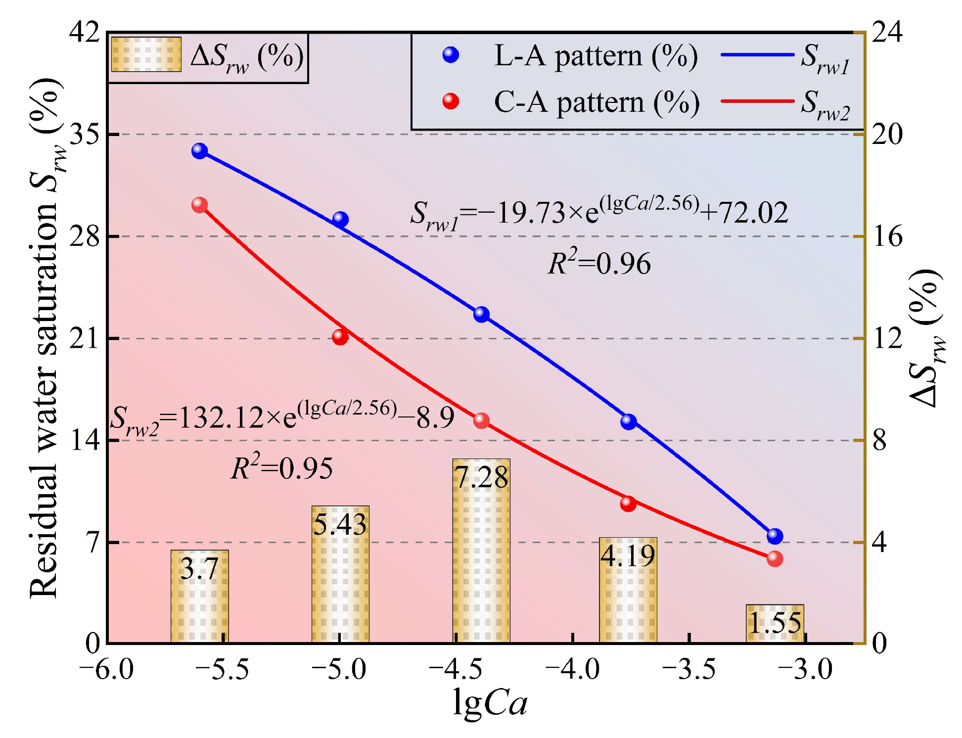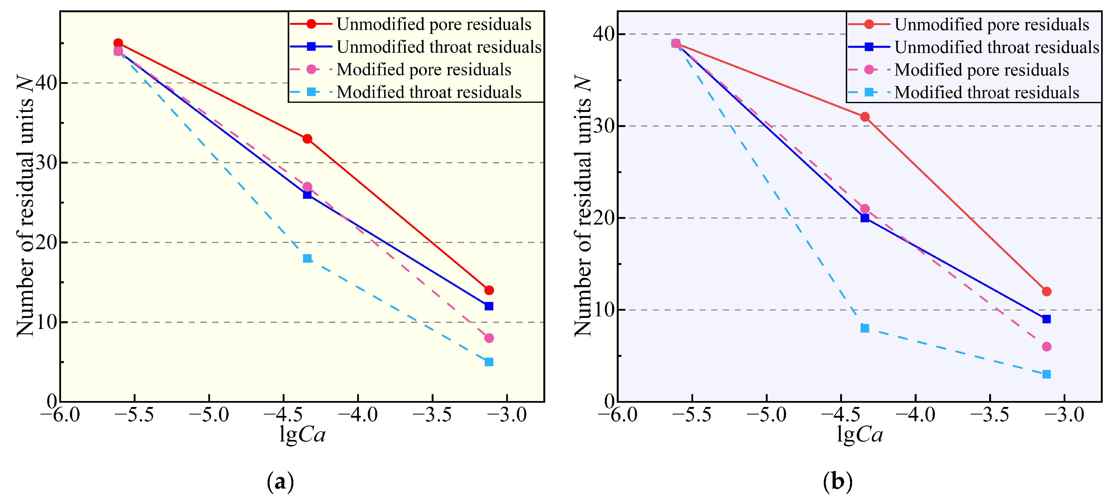 - The capillary number controls the exponential decay law of residual fluid saturation. The combination of central aggregation and neutral modification achieves the lowest residual fluid saturation (5.87%) at lgCa = −3.12, and the number of residual clusters decreases by 66.7%.