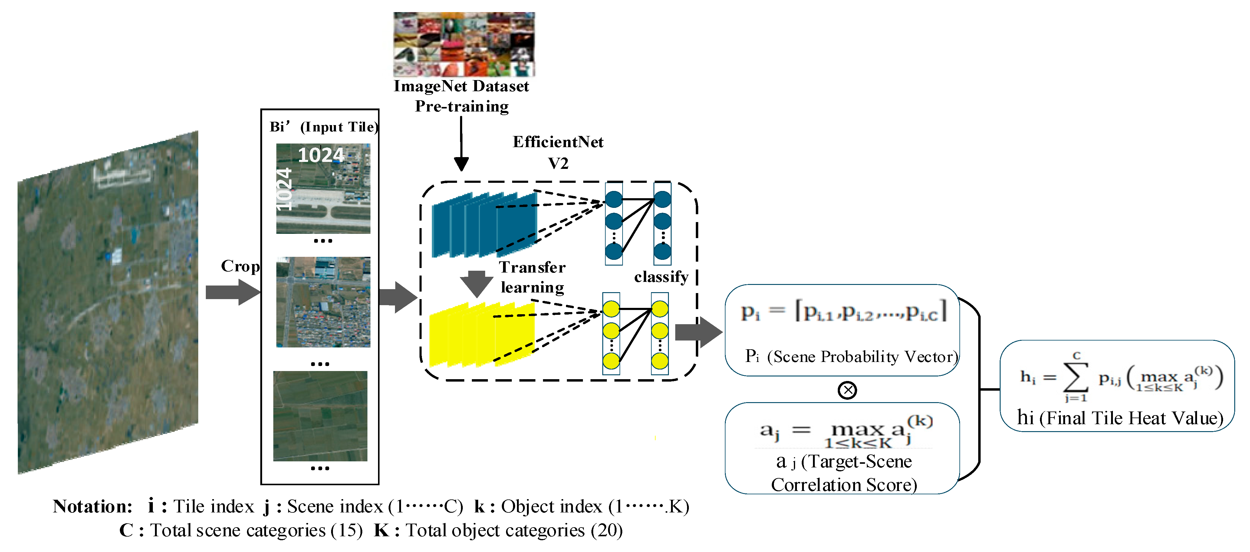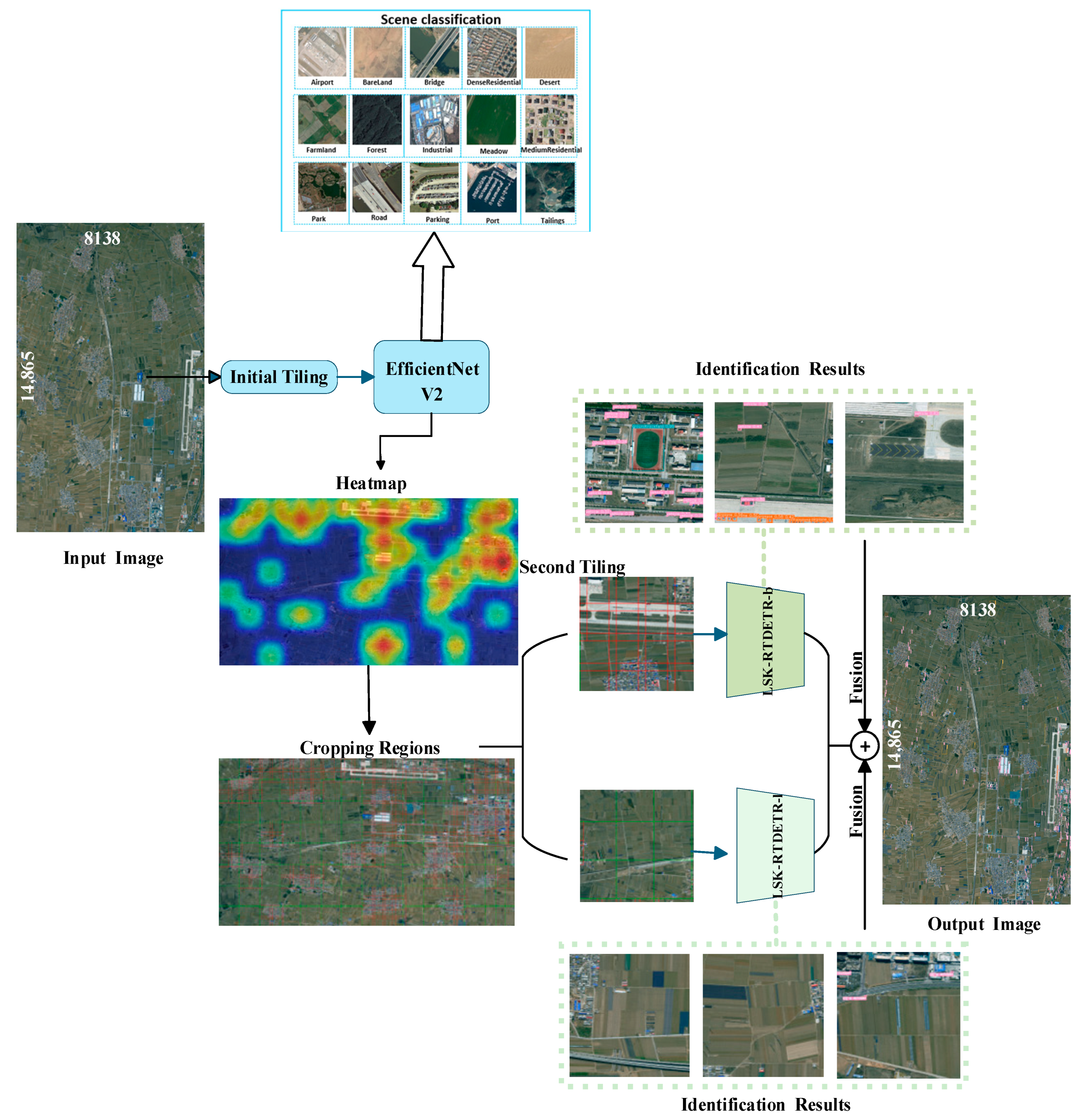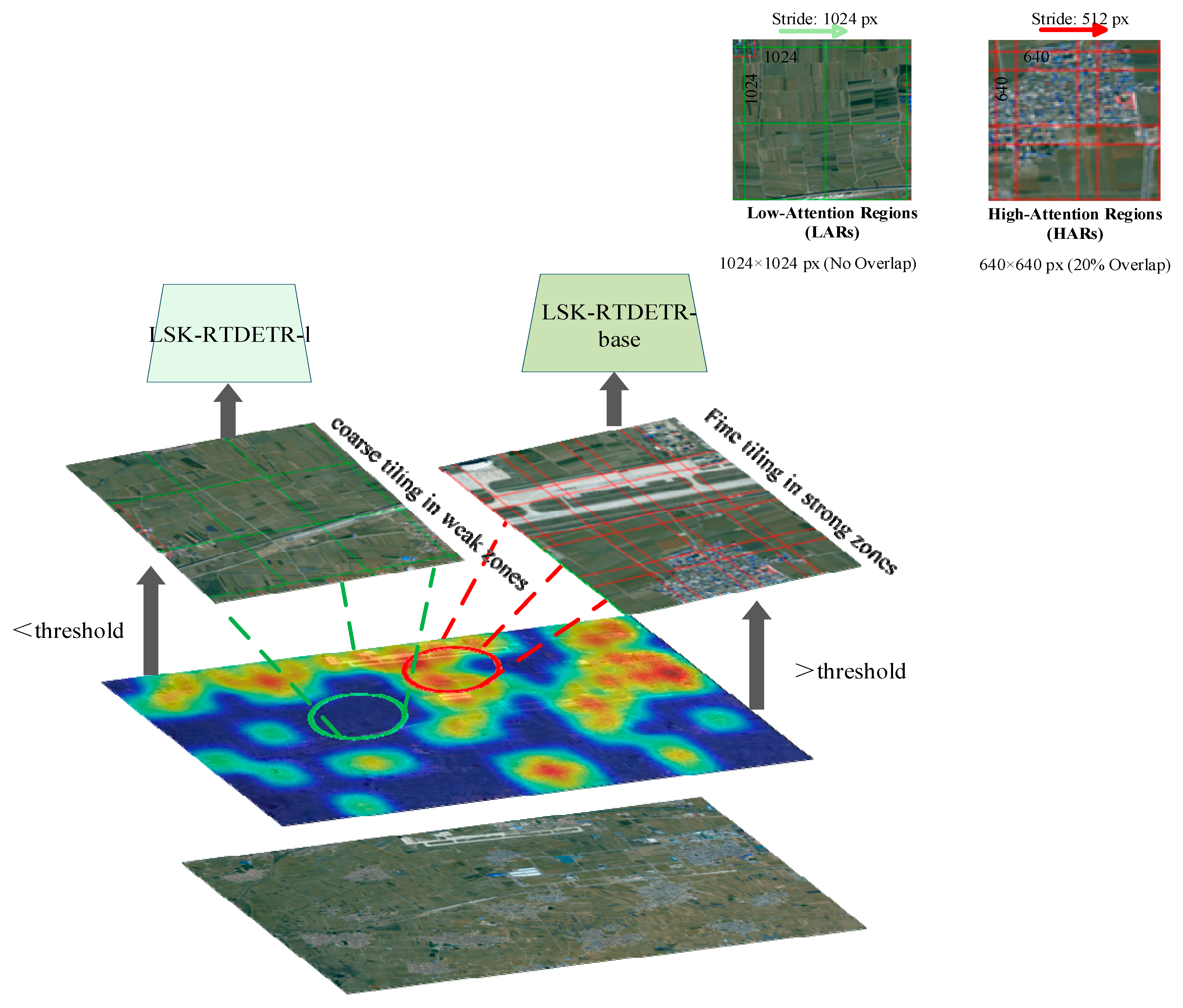 To overcome these limitations, we propose a scene heatmap–guided adaptive tiling and dual-model collaborative framework tailored for ultra-wide-area RSIs. Unlike methods that rely solely on low-level features or grid-level activations, our approach introduces a global semantic perception mechanism. An EfficientNetV2-based classifier generates a heatmap encoding the target–scene correlation for each coarse tile; the image is then partitioned into HARs (high heat, dense target) and LARs (low heat, sparse target) via a dynamic threshold. High-attention regions undergo fine-grained tiling and are processed by a high-precision detector, while wea-attention regions use coarse tiling and a lightweight model. This demand-driven allocation markedly reduces redundant computation in empty areas, maintains high accuracy for both small and cross-tile large objects, and achieves superior inference efficiency and robustness across diverse resolutions.