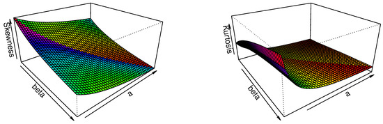Bowley’s skewness (Bo) and Moor’s kurtosis (Mo) depend on model quantiles, making them well-suited for describing the distributional characteristics of the proposed model. Therefore, the skewness and kurtosis of the model can be analyzed using these quantile-based functions (see [15]). Figure 2 illustrates that for fixed values of , the skewness decreases as both and a increase. Similarly, the kurtosis also exhibits a decreasing trend with increasing values of and