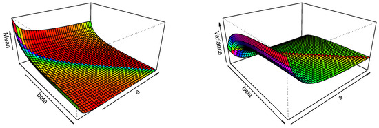 Table 2 presents numerical values of the first four raw moments for selected parameter combinations. For small parameter values (), the distribution exhibits heavy tails, reflected in extremely large higher-order moments. As the parameters increase, the moments decrease substantially, indicating a lighter tail and greater concentration of the distribution. For larger settings (), the first four moments are relatively close, suggesting that the distribution becomes sharply peaked with limited variability. The mean and variance of the proposed model are determined by setting and , respectively, as outlined in (10). Figure 3 illustrates that for a fixed the mean of the proposed model decreases as the parameters and a increase. Conversely, the variance of the model initially increases and then significantly decreases as both and a increase.