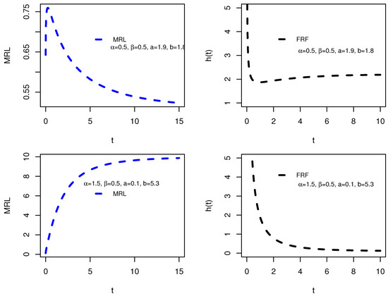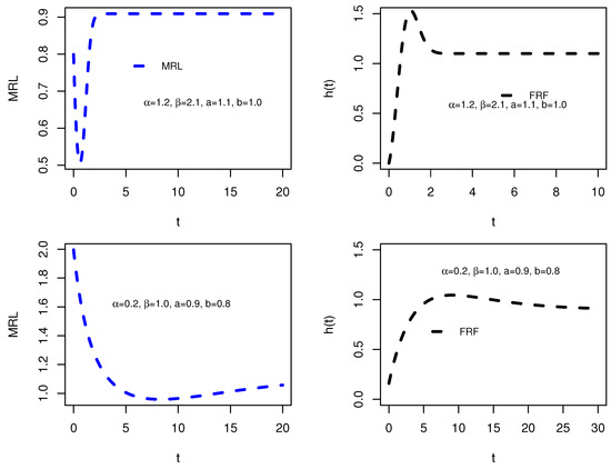 The MRL and FRF are inversely related in the sense that they describe different aspects of the same survival behavior. MRL and FRF are linked mathematically because the MRL can be expressed in terms of the FRF, since Moreover, the MRL and FRF are related by Clearly, The MRL and FRF uniquely determine a distribution, see [20,21]. Additional, the relation discussed in [22] is as follows: increasing MRL ⇒ decreasing FRF and decreasing MRL ⇒ increasing FRF. Further, ref. [23] proved that an upside-down bathtub shape MRL ⇒ bathtub shape FRF. Moreover, ref. [24] discussed that the MRL and FRF have a reciprocal relationship as Consequently, we can say that the bathtub shape MRL ⇒ upside-down bathtub shape FRF. One can see [25]. Figure 4 and Figure 5 demonstrate the graphical analysis, highlighting how variations in parameters affect the inverse relationship between these two reliability measures.