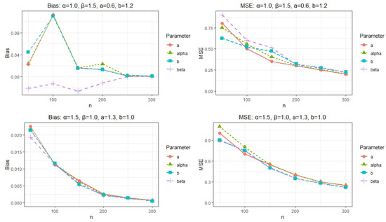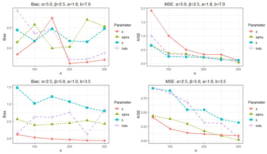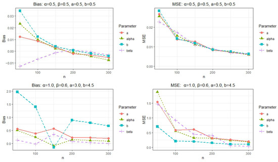 Due to the analytical intractability of Equation (15), we employ a numerical integration available in R software. To investigate the identifiability of the model, we consider selected parameter scenarios; here, there is no systematic method of parameter choice because it is not a specific application that requires parameter optimization. Specifically, we fix the parameter vectors and and construct several alternative vectors , considering both the case where and the case where . The corresponding KLD values computed for each scenario are summarized in Table 3 and Table 4. The results demonstrate that whenever and that holds only when . These outcomes support the identifiability of the proposed model under the considered cases. Nonetheless, we recognize that these illustrative examples alone do not suffice to establish general claims about the local or global identifiability of the proposed model across its entire parameter space.