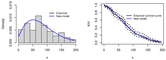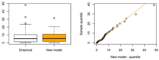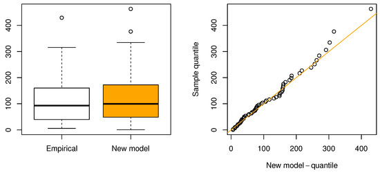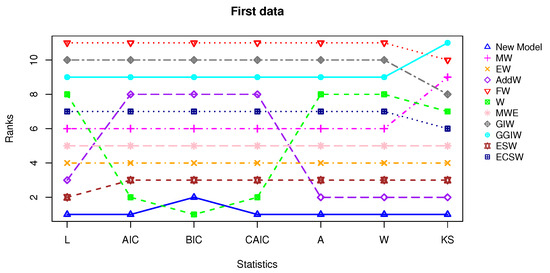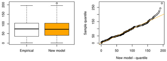 This dataset was described in [48]; it includes the daily new deaths due to COVID-19 in California, USA, collected from the month of to in the year 2020. Table 12 outlines the MLEs for each model, and the information matrix is given below, while Table 13 illustrates that the proposed distribution outperforms other models in terms of fit. The proposed distribution consistently registers more of the smallest values across evaluative criteria and goodness-of-fit measures, leading it to be ranked as the top model in Figure 16. The proposed model attains the highest log-likelihood value () and the lowest values for AIC (2087.04), BIC (2096.95), and CAIC (2087.18), indicating a superior trade-off between fit and complexity. Additionally, it achieves the smallest Kolmogorov–Smirnov statistic (0.0602) and a reasonable p-value (0.4597), suggesting a good agreement with the empirical distribution. Followed by AddW and EW, the EW distribution, ranking second in AIC/BIC, has a moderately larger KS statistic (0.0817) and lower p-value (0.1365), indicating a slightly weaker fit. Models such as W, ESW, and ECSW offer moderate performance but fall behind in both parsimony and goodness-of-fit measures. The ECSW model records a higher KS statistic (0.1378) with a very low p-value (0.0001), reflecting poor fit despite reasonable AIC values. In contrast, the GGIW and FW models perform the worst. The GGIW model shows the largest AIC (2337.76), BIC (2347.67), and KS statistic (0.2447), with a highly significant p-value, indicating severe misfit. Similarly, the FW model records the second-worst fit statistics (KS = 0.3541, A = 10.6004), making both models unsuitable for this dataset. This demonstrates the proposed model’s exceptional ability to adequately reflect the data, making it the most suitable model for this case of study according to these metrics. Moreover, to corroborate our conclusions, Figure 17 shows the proposed distribution’s excellent fit through the displayed fitted PDF and survival function. Additionally, Figure 18 features a box plot and a QQ plot, confirming the proposed model’s alignment with the observed data.