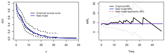 Visual fit assessment for the first dataset: survival function (left) and empirically fitted MRL (right).