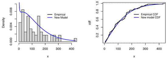 Visual fit assessment for the third dataset: histogram with the superimposed PDF (left) and empirically fitted CDF comparison (right).