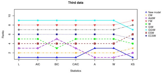 L, AIC, BIC, CAIC, A, W, KS (p-value), and rank as superscript for third dataset.