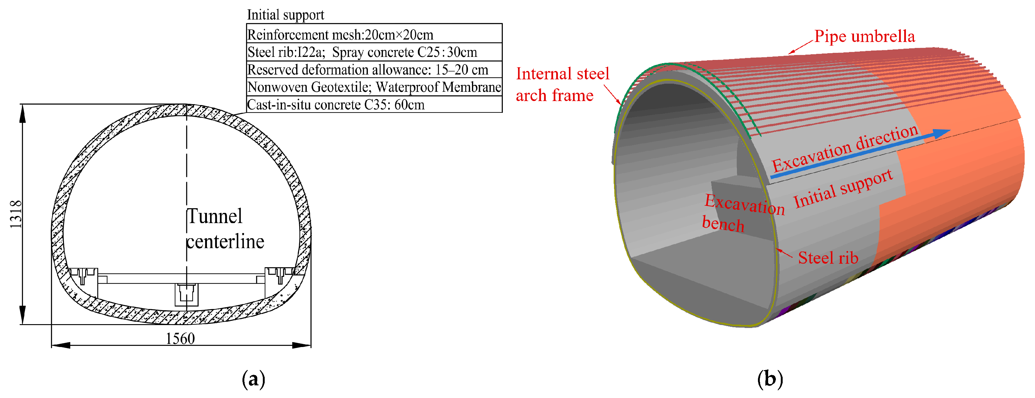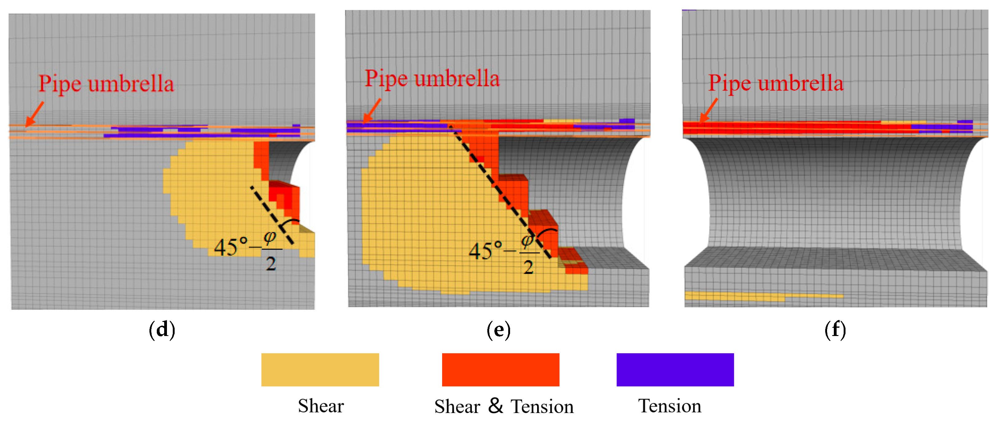 - Yao, Z.-X.; He, J.-W.; Zheng, G.-W.; Zhou, Q.-C.; Shi, L.-X.; Gao, X.-M.; Yang, Y.-W. Analysis of the Load Bearing Mechanism and Mechanical Properties of the Advanced Pipe Roof and Discussion on Its Engineering Application. Mod. Tunn. Technol. 2025, 62, 60–70. [Google Scholar]