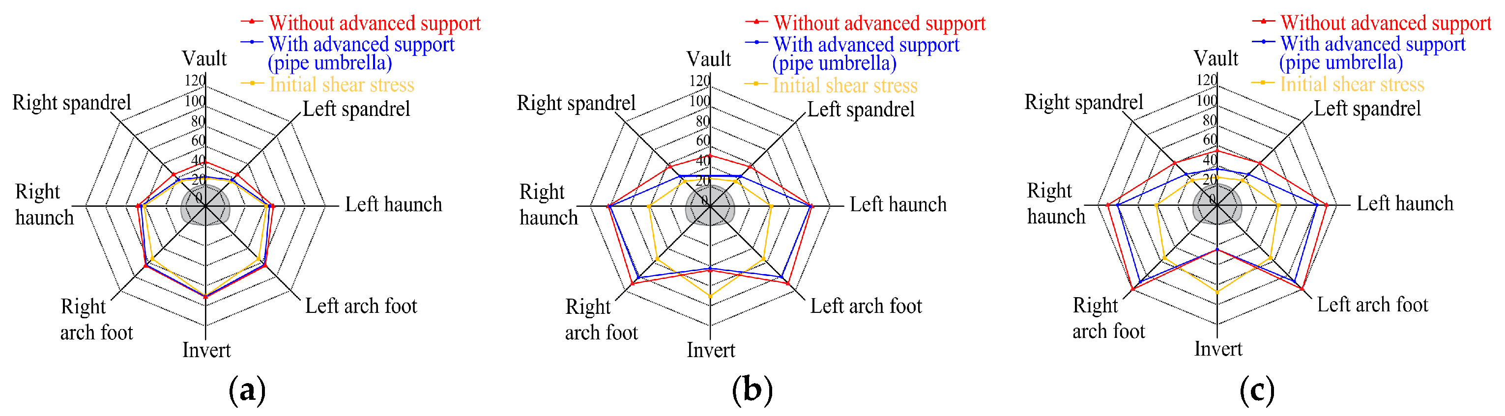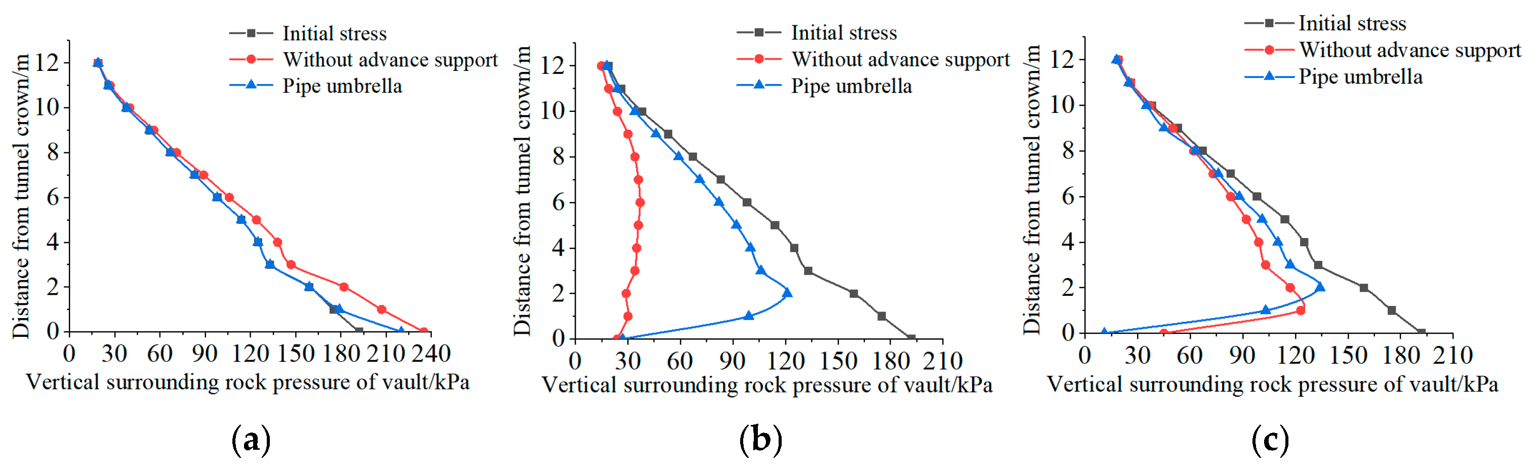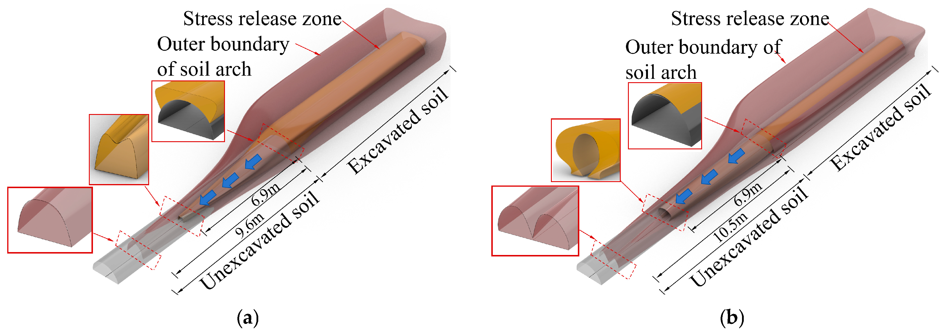 - The pipe umbrella support optimizes the formation mechanism and load-bearing efficiency of the soil arch. In unsupported conditions, the surrounding soil responds passively, leading to the development of a “passive soil arch” characterized by extensive coverage and considerable thickness, albeit with significant relaxation. In contrast, the pipe umbrella actively assumes and redistributes loads, prompting the surrounding soil to form an “active soil arch” with a greater influence depth and a markedly reduced relaxation zone, thus achieving efficient reconstruction of the load transfer path.