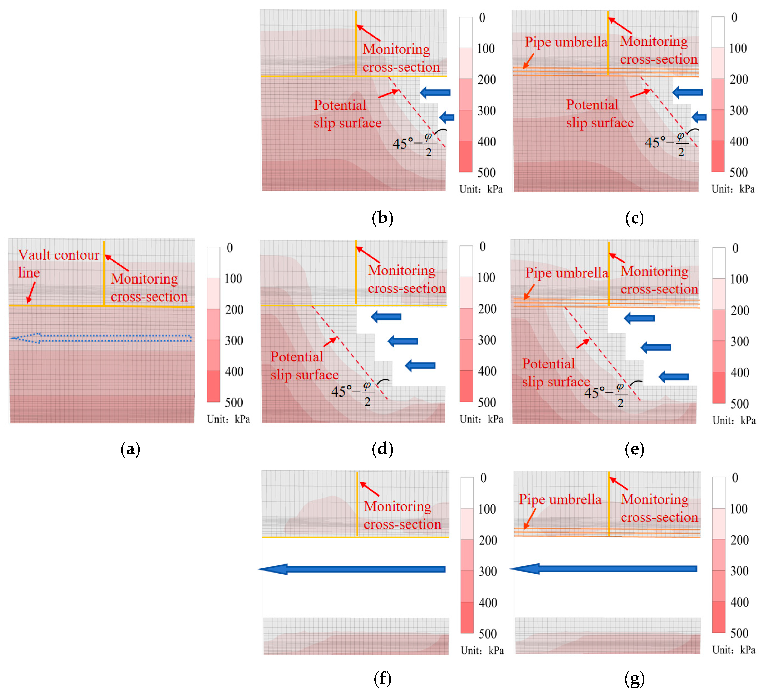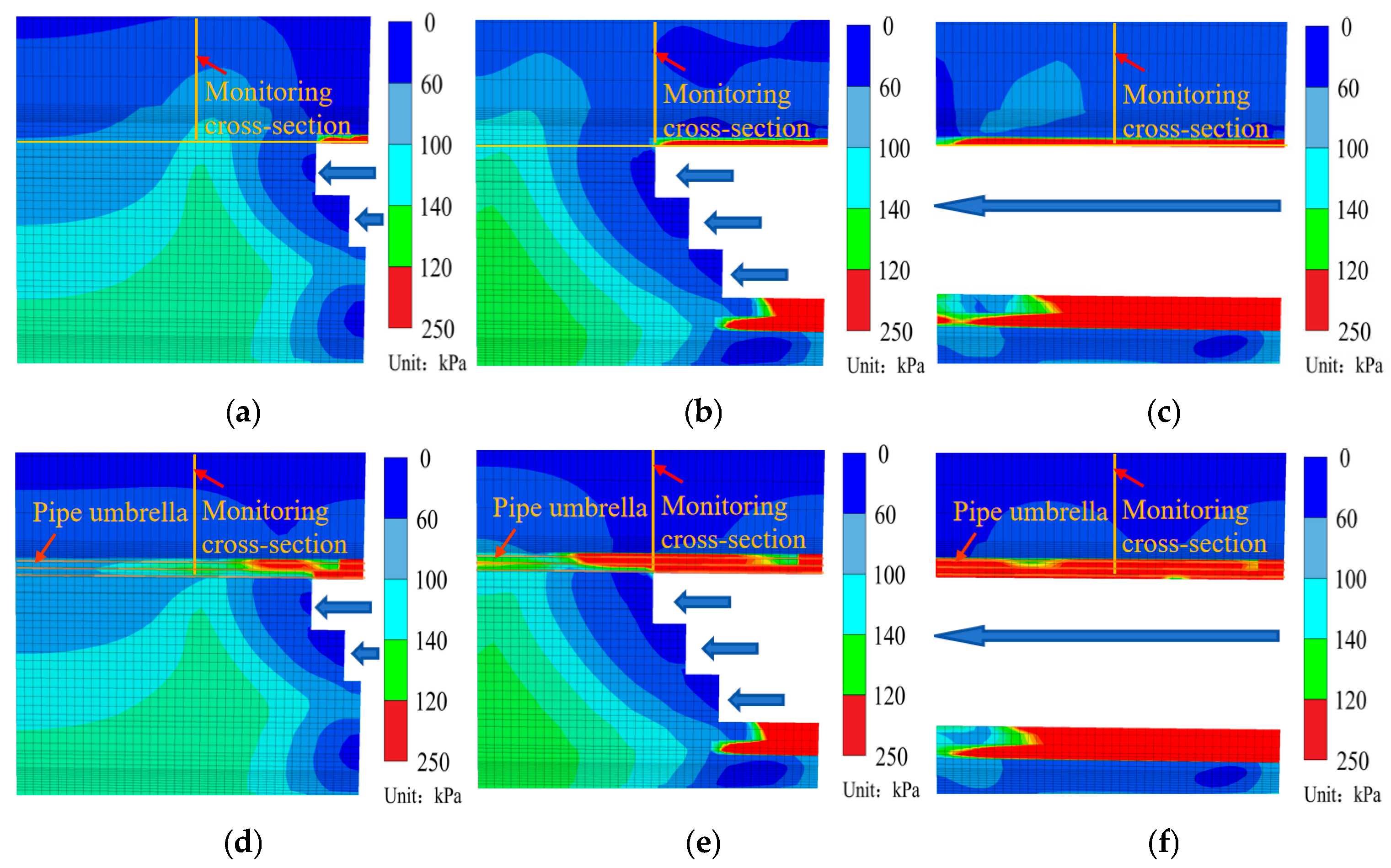 - The advanced pipe umbrella support system achieves effective full-process control over stress redistribution in the surrounding soil through its “pre-support and load-bearing” mechanism. This mechanism effectively alleviates stress concentration 0.5 D ahead of the tunnel excavation face, reduces the stress release magnitude at the vault from over 80% in unsupported conditions to below 30% when excavation reaches the monitoring section, and facilitates stable and orderly stress recovery following tunnel breakthrough. Ultimately, this results in the formation of a more efficient active pressure arch system with a higher load-bearing capacity.