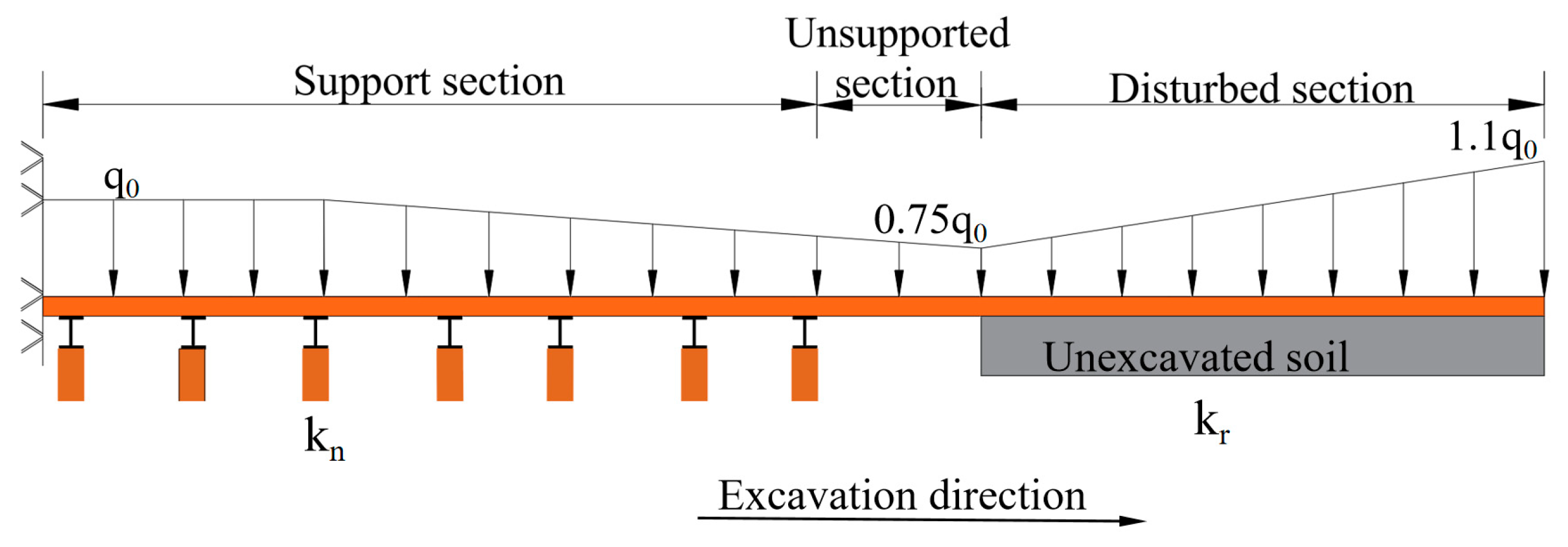 - Based on the spatiotemporal distribution characteristics of loads revealed by numerical simulation, the established Pasternak elastic foundation beam model, which accounts for the spatiotemporal effects of support, describes the segmented mechanical behavior of pipe umbrella in supported, unsupported, and disturbed zones. This model identifies the most unfavorable stress location of the pipe umbrella near the tunnel excavation face, theoretically elucidates its ‘longitudinal beam-forming’ mechanism from a mechanical perspective, and provides a quantitative theoretical tool for optimizing support parameters.