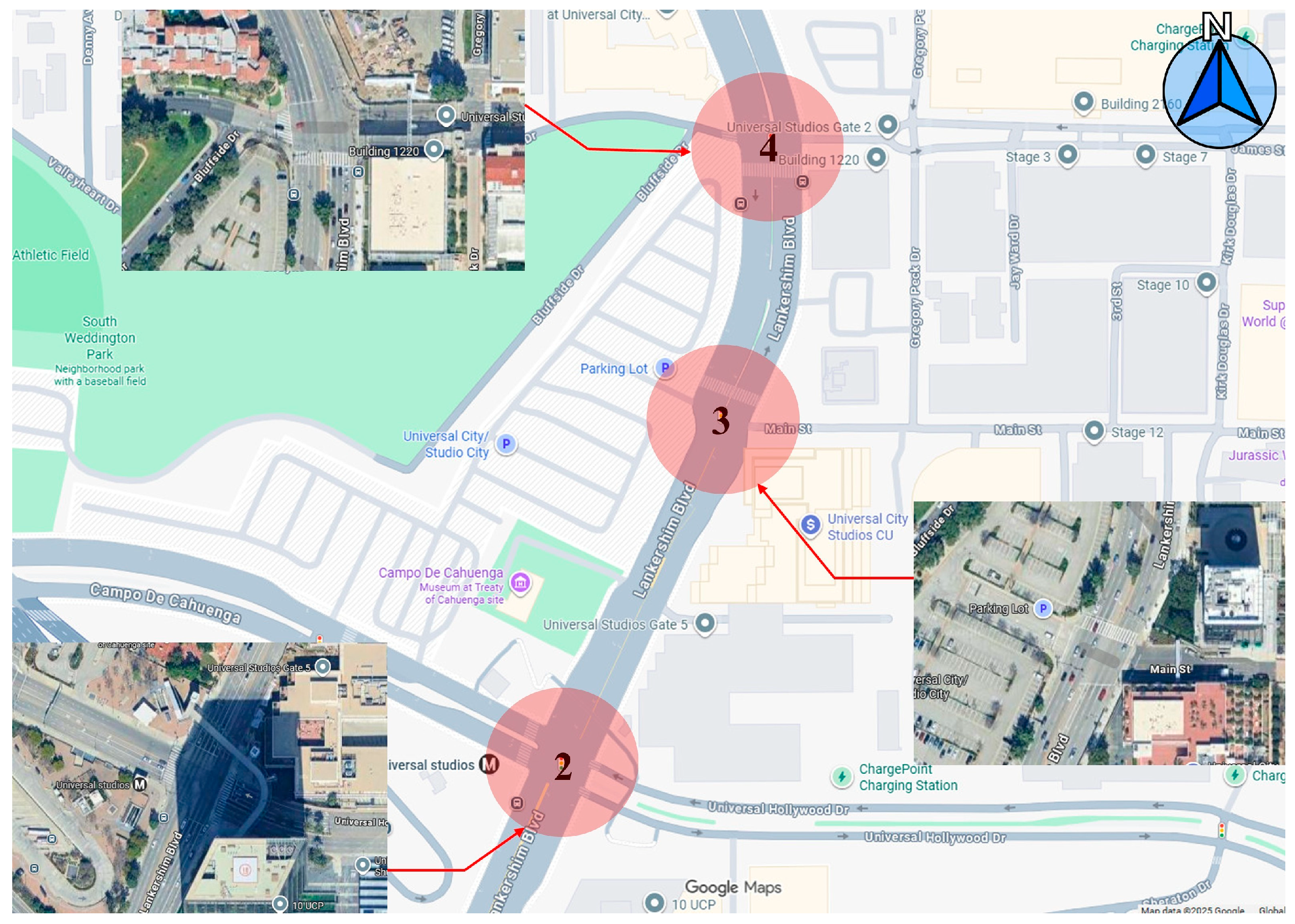 28]. In light of this, using the traffic flow data recorded on the Lankershim Boulevard segment from 8:30 to 8:45 as the data source, select intersections 2, 3, and 4 as the target intersections. Extract vehicle movement data within the region formed by these three intersections, and construct a road network model based on the trajectory data. The geographic location of the study area is shown in