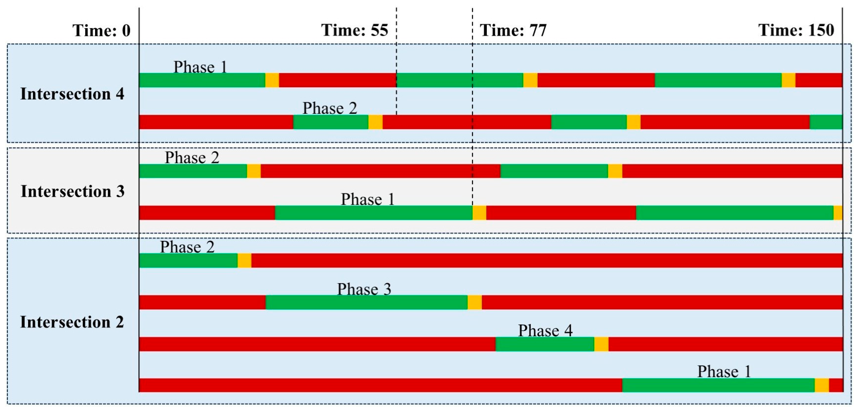 Table 5, it could be observed that the NBAs of the intersections constitute the dominant inflow paths, with a substantial number of vehicles entering the study area from the NBA of intersection 4 and exiting mainly through the SBA of intersection 2. Given that this directional flow represents the primary movement within the network and contributes most significantly to overall traffic demand, the green-wave coordination is designed along the NBAs to improve progression efficiency for these major-stream vehicles. The phase splits at each intersection were first determined using the Webster signal timing method, in which the optimal cycle length and the green–yellow allocations for each phase were calculated based on the observed approach volumes and lane configurations derived from the NGSIM trajectory data. The average vehicle speed at the NBA of intersection 4 is 5.56 m/s, while that at the NBA of intersection 3 is 11.11 m/s. For intersection 2, the average vehicle speed at both the NBA and SBA is 8.33 m/s. Additionally, the recorded segment length of the NBA at intersection 4 is 100 m, the distance between the center points of intersection 4 and intersection 3 is 500 m, and the distance between the center points of intersection 3 and intersection 2 is 650 m. After the phase splits and cycle lengths were obtained through the Webster method, the offsets between consecutive intersections were then assigned according to these distances and the prevailing average speeds along the north–south direction. Under these physical road conditions, traffic demand characteristics, and prevailing speeds, the resulting signal timing configuration for green wave coordination targeting the north-to-south traffic flow is illustrated in