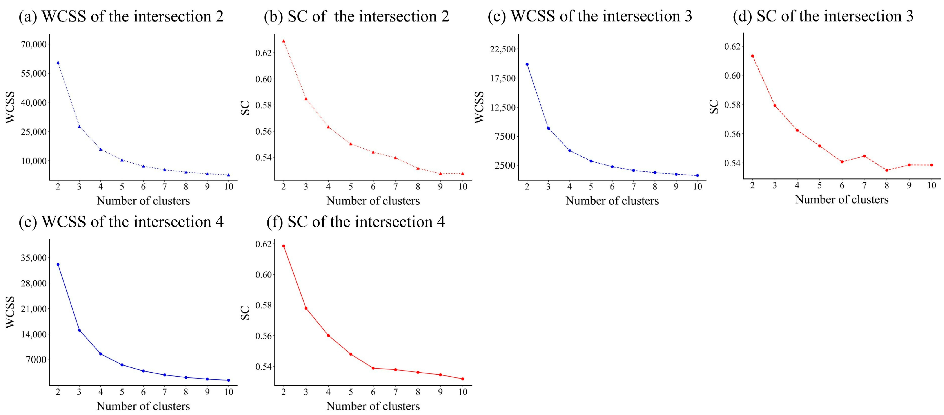 10], the distribution characteristics of TTC at each intersection were analyzed using clustering methods. Specifically, the elbow method and silhouette coefficient (SC) were employed to determine the optimal number of clusters for intersections 2, 3, and 4. The elbow method identifies the optimal number of clusters by locating the inflection point (elbow) where the within-cluster sum of squares (WCSS) ceases to decrease substantially, whereas the silhouette coefficient (SC) method favors the cluster number that maximizes the average silhouette score. The search range for the number of clusters was set to [