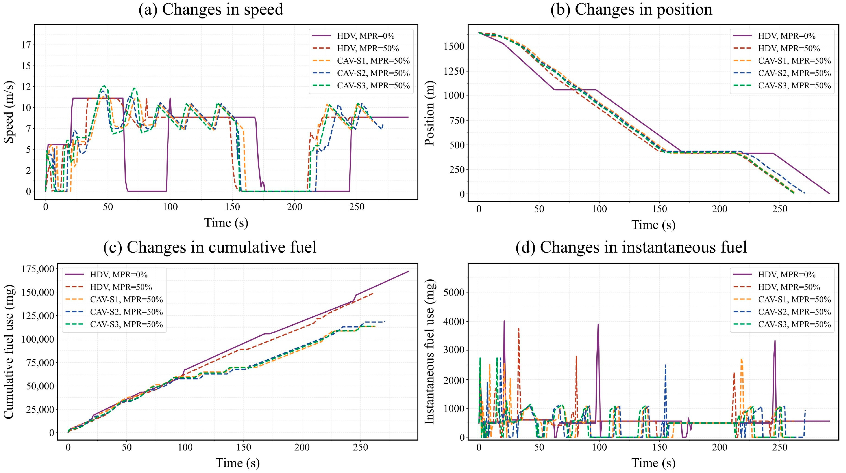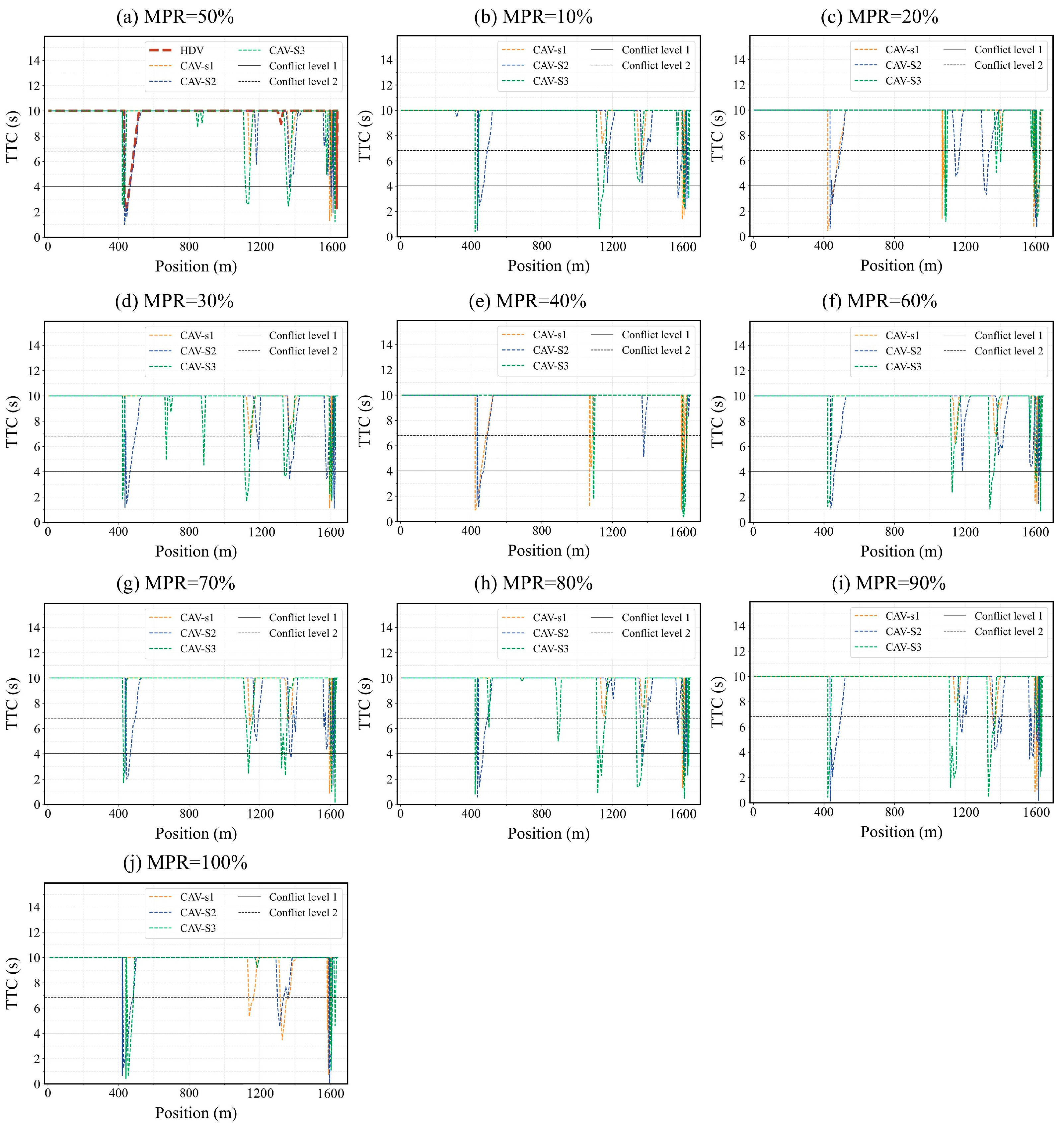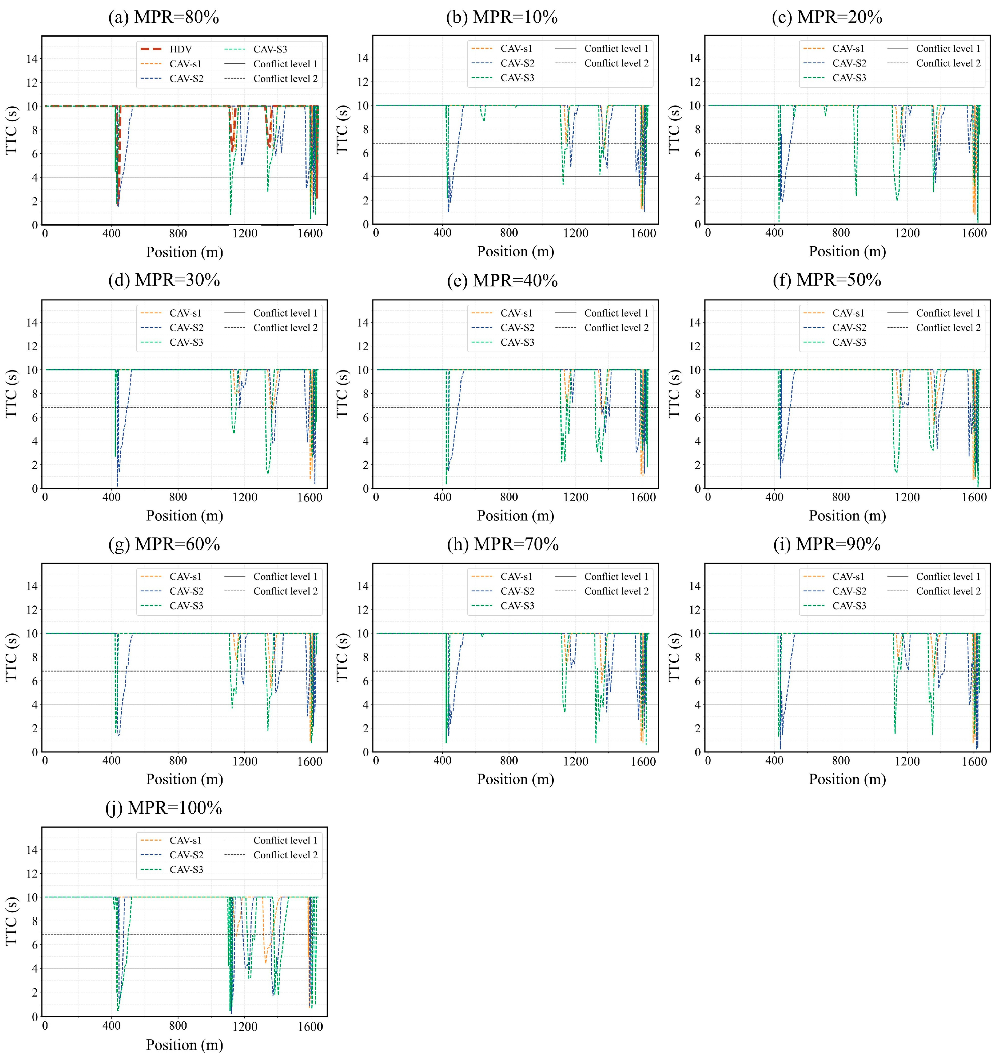 The MPRs of CAVs were set at 0%, 10%, 20%, 30%, 40%, 50%, 60%, 70%, 80%, 90%, and 100%, progressively integrating CAVs into the traffic flow originally composed solely of HDVs [