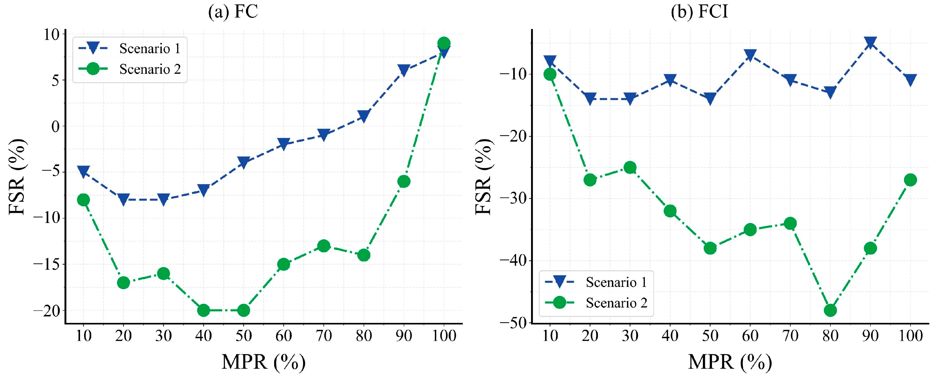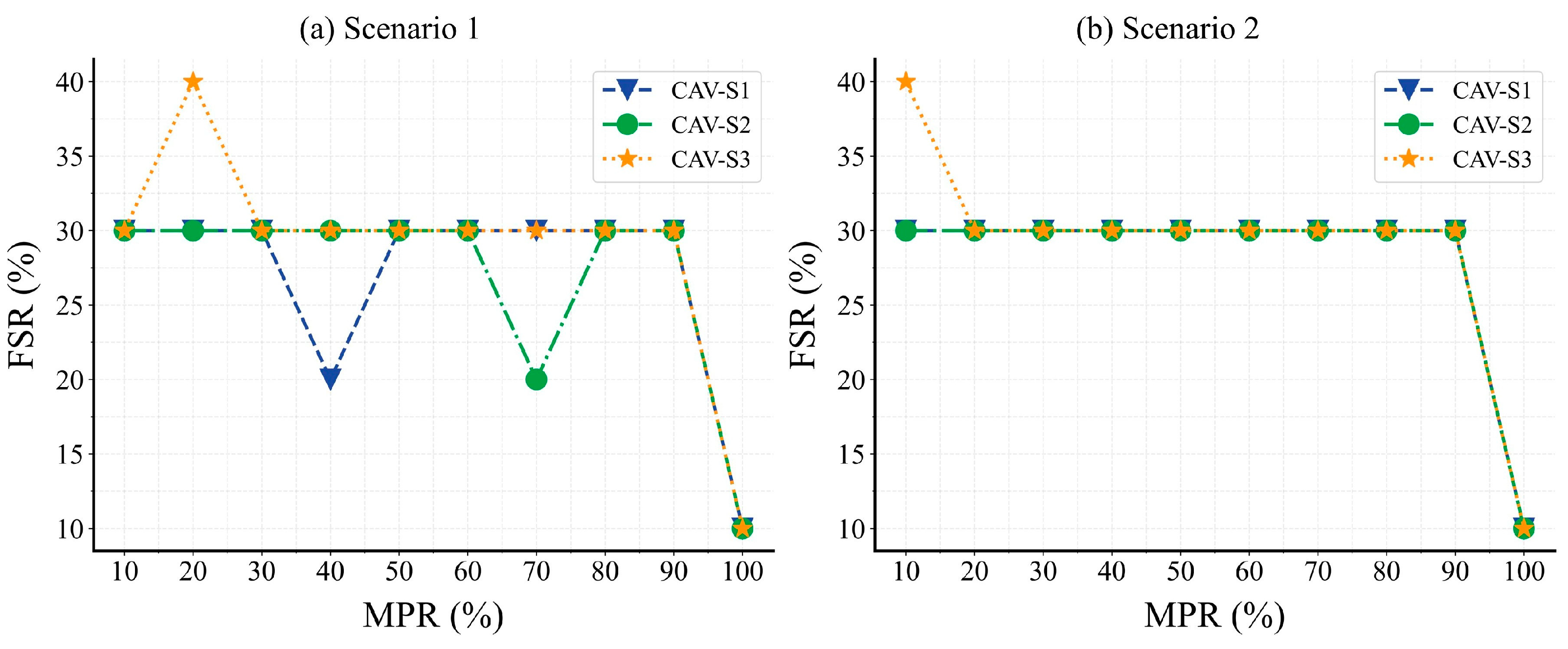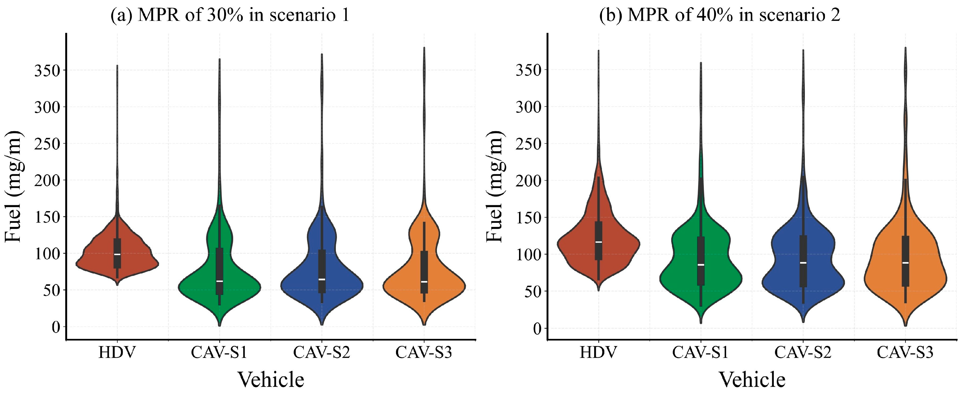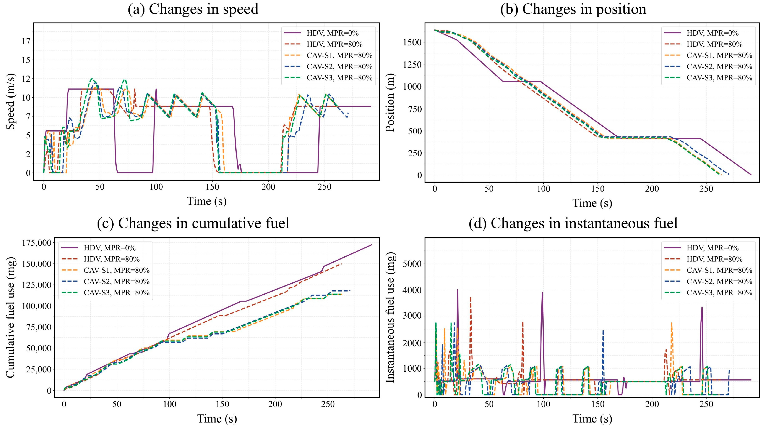 The MPRs of CAVs were set at 0%, 10%, 20%, 30%, 40%, 50%, 60%, 70%, 80%, 90%, and 100%, progressively integrating CAVs into the traffic flow originally composed solely of HDVs [