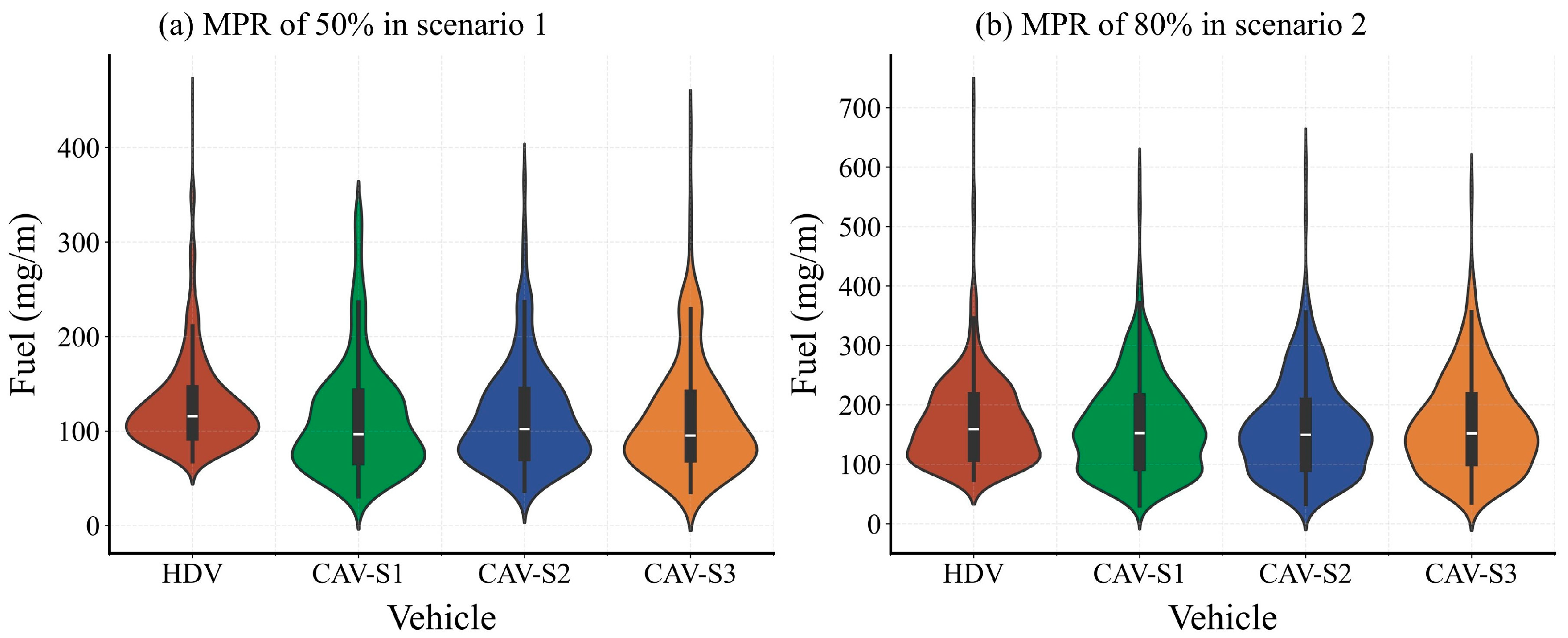 Table 10, which indicates that, apart from differences in control strategies and perception capabilities, no discrepancies exist in the inherent vehicle parameters across different vehicle types. Furthermore, all vehicles are modeled as gasoline-powered passenger cars compliant with Euro 4 emission standards, with fuel consumption derived from the emission factors provided by the handbook emission factors for road transport (HBEFA) version 3.1 [