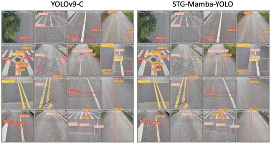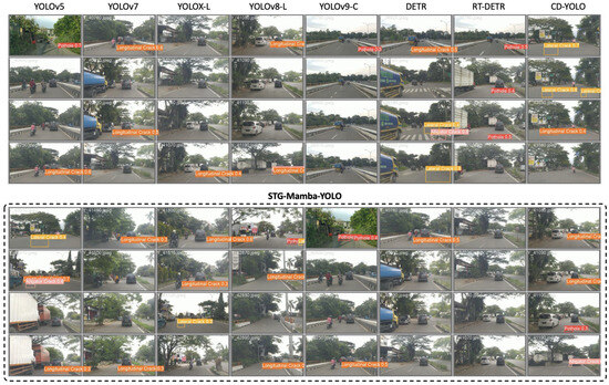 A primary advantage demonstrated by our model is its markedly improved robustness in complex scenes laden with visual distractors. As depicted in the second row of the figure, the baseline model is easily confounded by road markings and varied pavement textures, resulting in a cluttered output with numerous false positives. In stark contrast, our STG-Mamba-YOLO, empowered by its graph-based reasoning module, correctly identifies the true ‘Repair’ and ‘D10’ damages while effectively suppressing the misleading visual cues from painted lines. This capability results in a substantially cleaner and more reliable detection output.