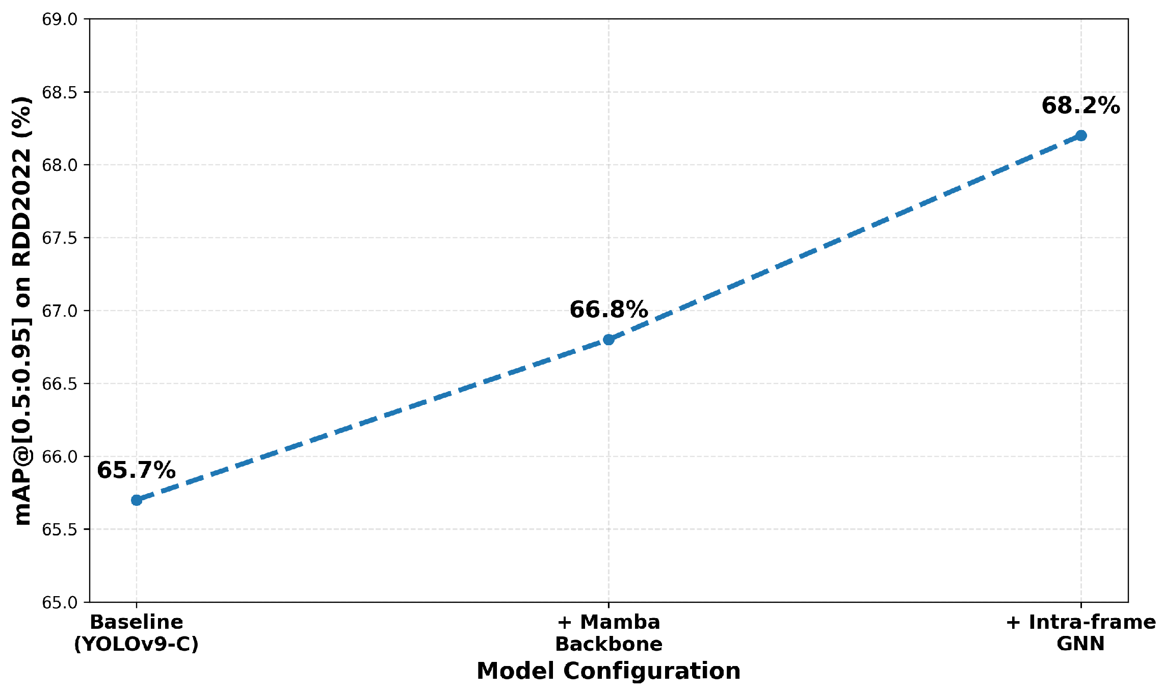 This result provides strong quantitative evidence that our temporal graph Mamba module effectively mitigates the flickering phenomenon inherent in frame-by-frame processing. By explicitly modeling the evolution of the damage graph across time, our framework produces temporally coherent and reliable detections—a critical prerequisite for practical deployment in continuous road monitoring systems.