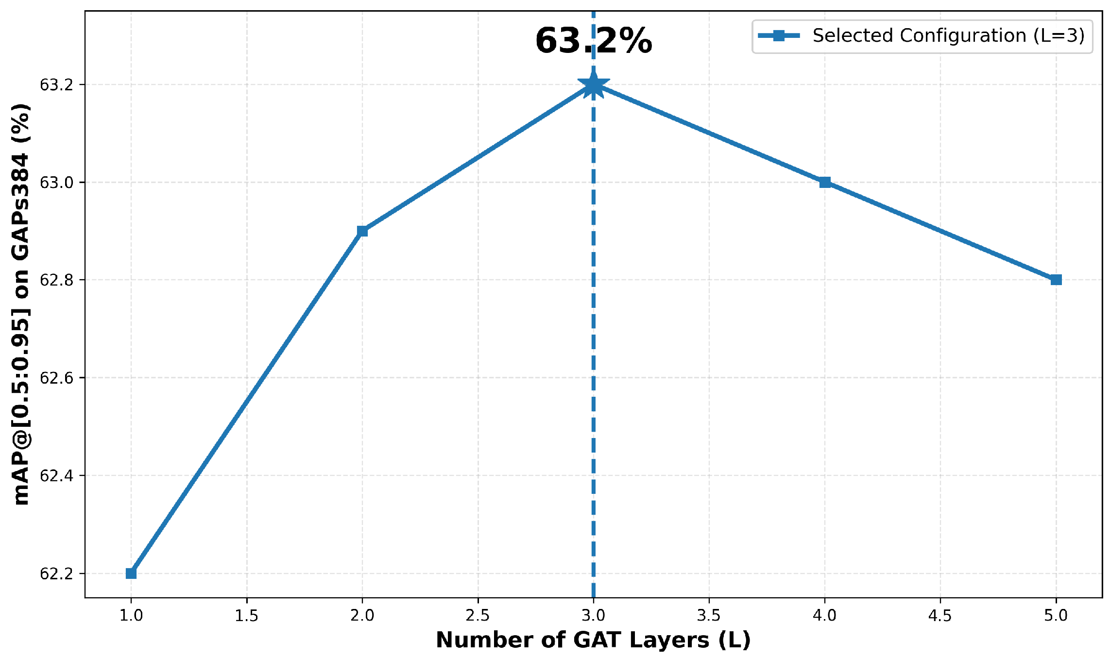 Impact of GAT layer depth on performance, evaluated on the GAPs384 dataset. Performance peaks at L = 3.