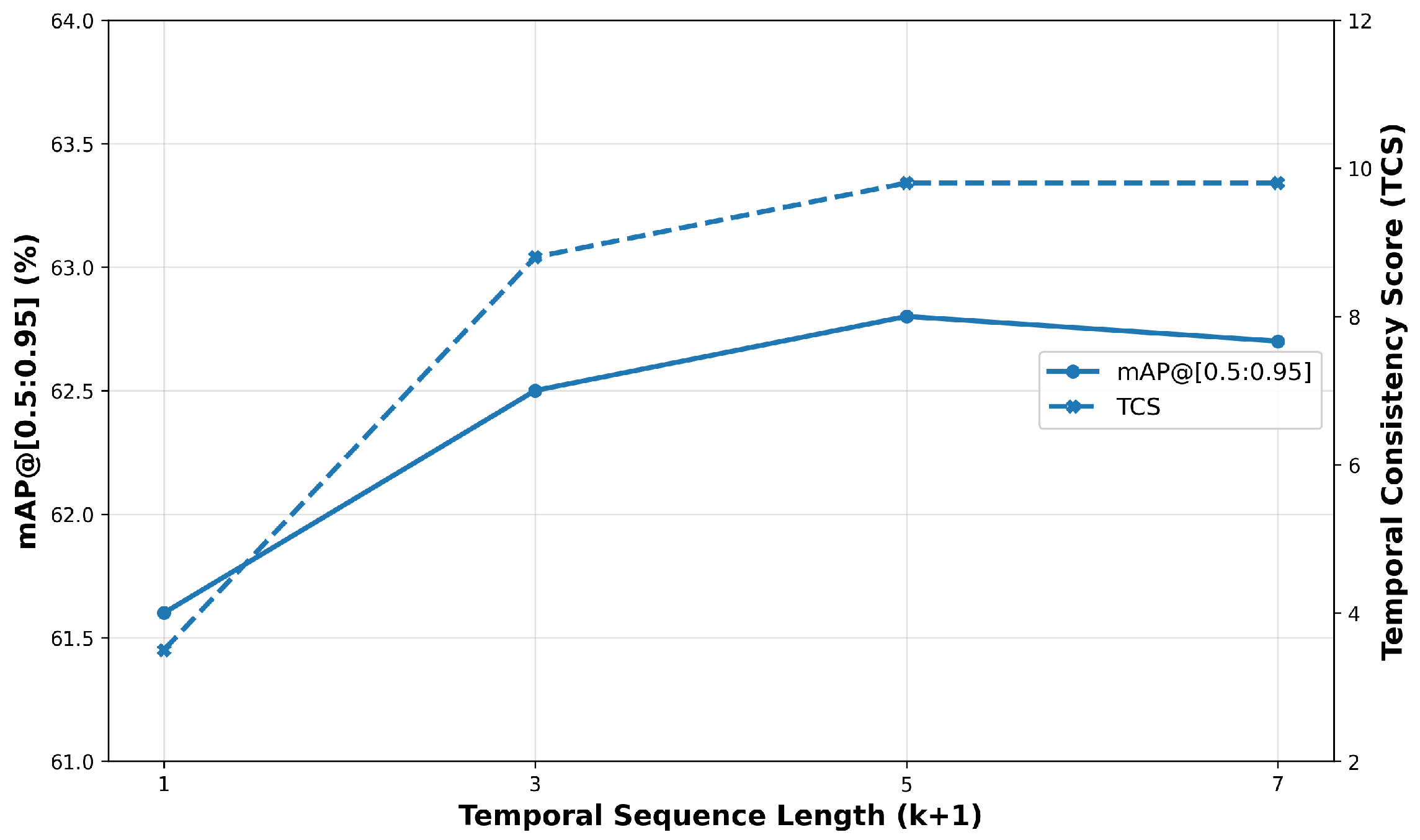 Figure 6 visualizes the critical trade-off between detection accuracy and temporal stability as a function of sequence length. The dual-axis plot reveals that while mAP (blue line) begins to plateau around a sequence length of five frames, the Temporal Consistency Score (TCS, red line) exhibits a dramatic and sustained increase up to this point. This visualization powerfully underscores the value proposition of our temporal module, justifying our selection of a five-frame sequence. This configuration strikes an optimal balance, achieving near-maximal temporal stability for only marginal gains in mAP, without incurring undue computational latency.