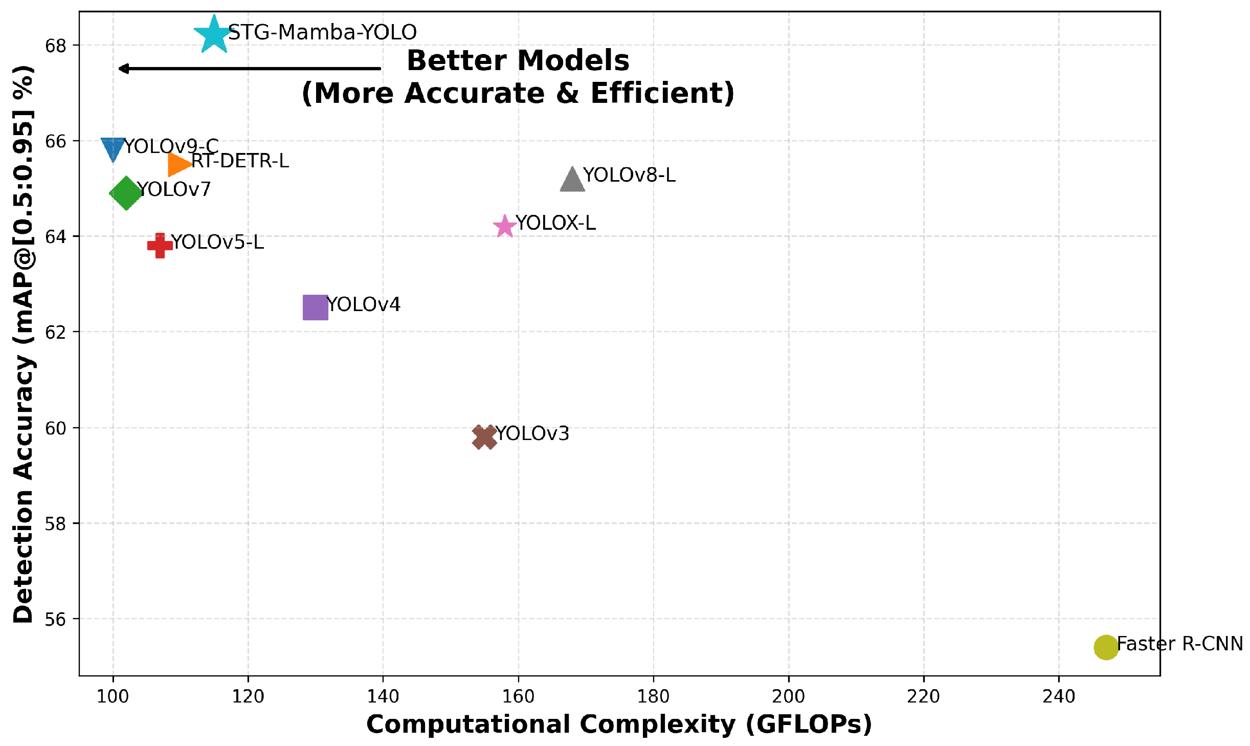 Figure 7 situates our model within the broader landscape of SOTA detectors by plotting detection accuracy against computational complexity. In this plot, where each point represents a unique model, the top-left corner signifies the ideal trade-off (high accuracy, low complexity). Our STG-Mamba-YOLO is clearly positioned in this desirable Pareto-optimal region. It achieves the highest accuracy among all compared methods while maintaining a computational cost comparable to the highly efficient YOLOv9-C baseline. This result demonstrates that our framework establishes a new, superior Pareto front for the task of road damage detection.