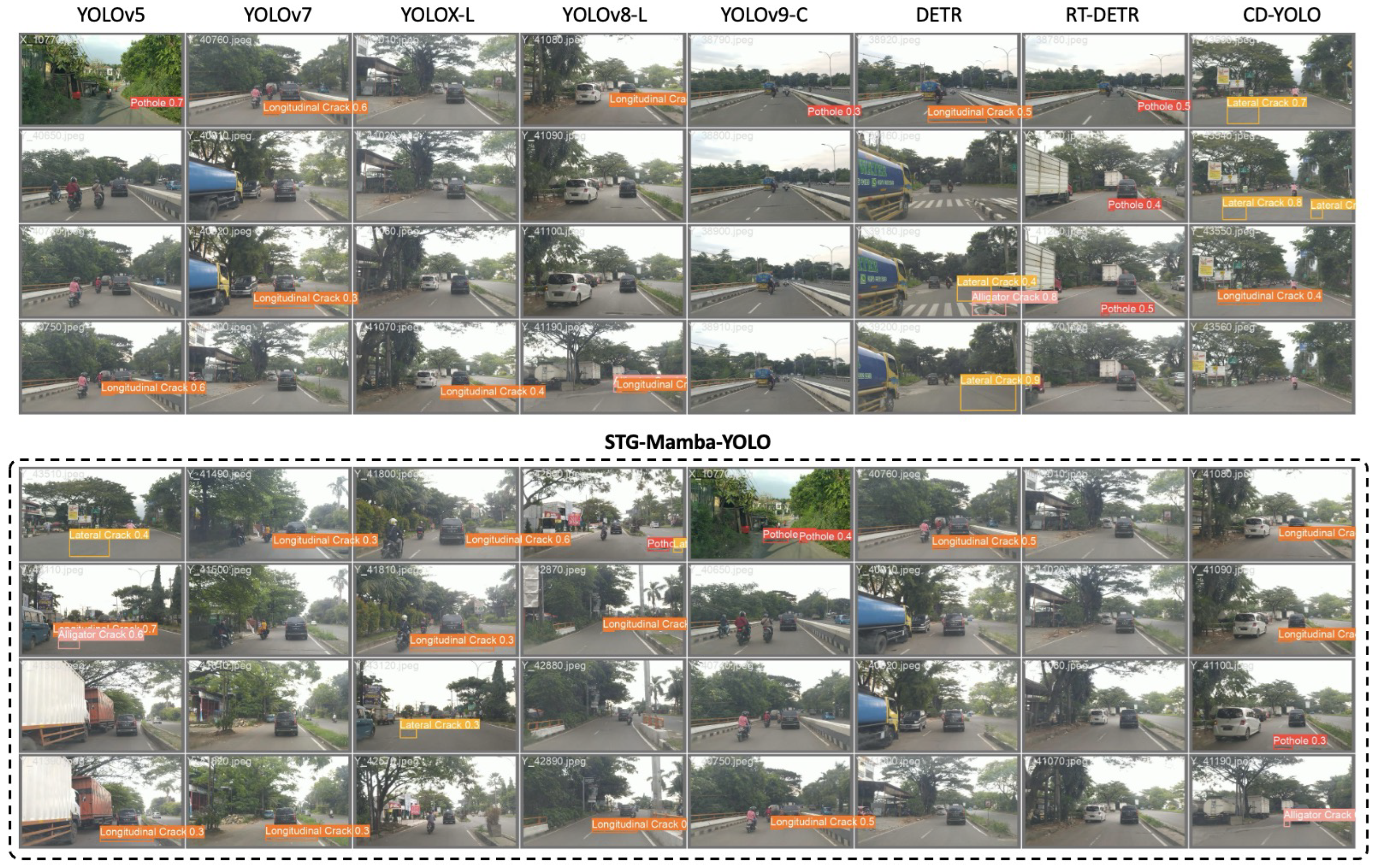 In stark contrast, the bottom panel demonstrates that our STG-Mamba-YOLO maintains a remarkably high level of performance. It successfully and confidently identifies a diverse array of damages—including longitudinal, lateral, and alligator cracks, as well as potholes—even when partially obscured by deep shadows or embedded within complex scenery. This remarkable robustness is a direct consequence of our model’s hierarchical architecture. The Mamba backbone’s global receptive field enables it to perceive the underlying continuity of a crack despite local interruptions from shadows. Concurrently, the GNN module reinforces these perceptions by leveraging the broader context of the surrounding road area, which aids in distinguishing true damages from visual noise.