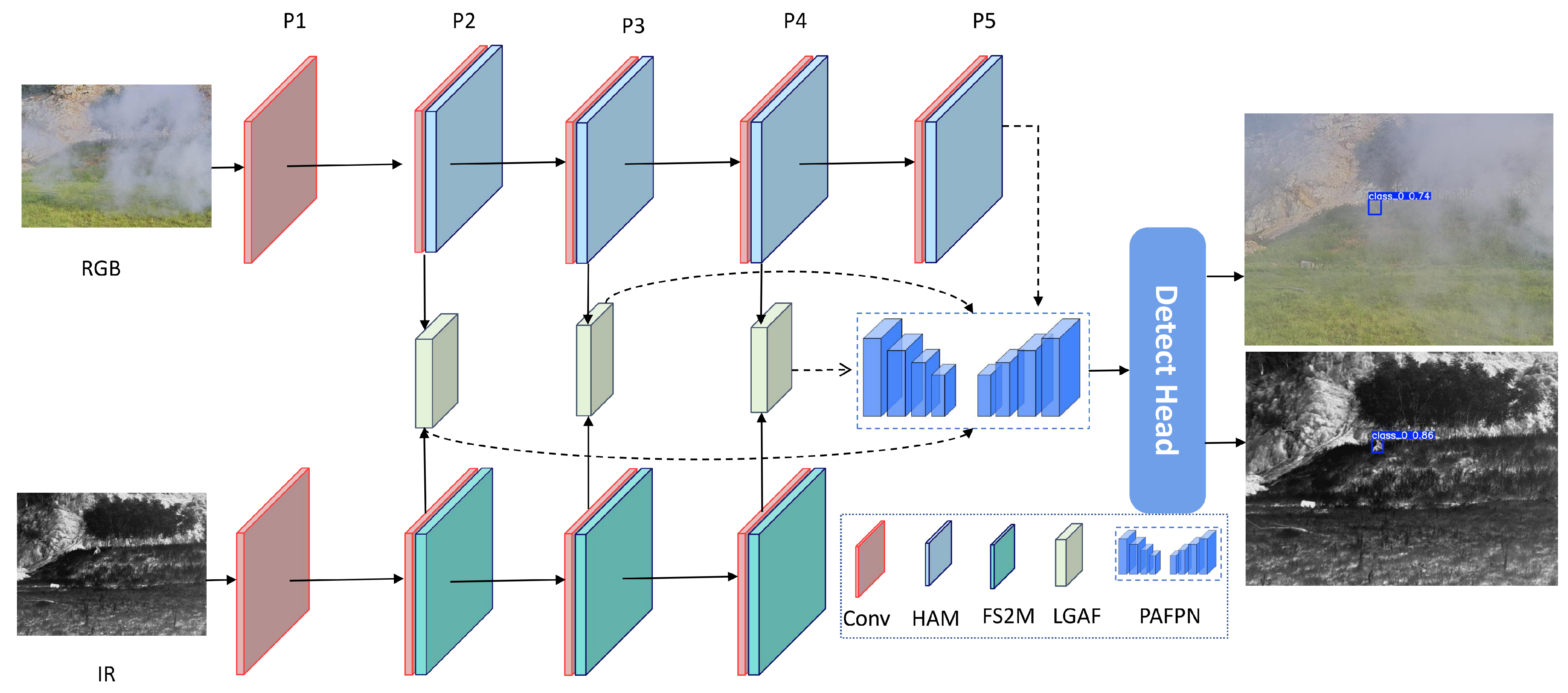Figure 2. The model adopts a lightweight dual-branch asymmetric fusion framework, designed to fully exploit the complementary properties of visible (RGB) and infrared (IR) images for object detection. Given paired RGB and IR images as inputs, two independent backbone networks are used for feature extraction. In the RGB branch, HAM is employed to extract salient features from levels P1–P5, adaptively enhancing task-relevant information while suppressing background clutter, thereby highlighting structural details and semantic cues in well-illuminated regions. In parallel, the IR branch uses FS2M to extract features from P1–P4, modeling the spatial- and frequency-domain distributions of thermal radiation patterns. This enables cross-modal consistency adjustment and information compensation, and strengthens the representation of regions with weak textures or low contrast.